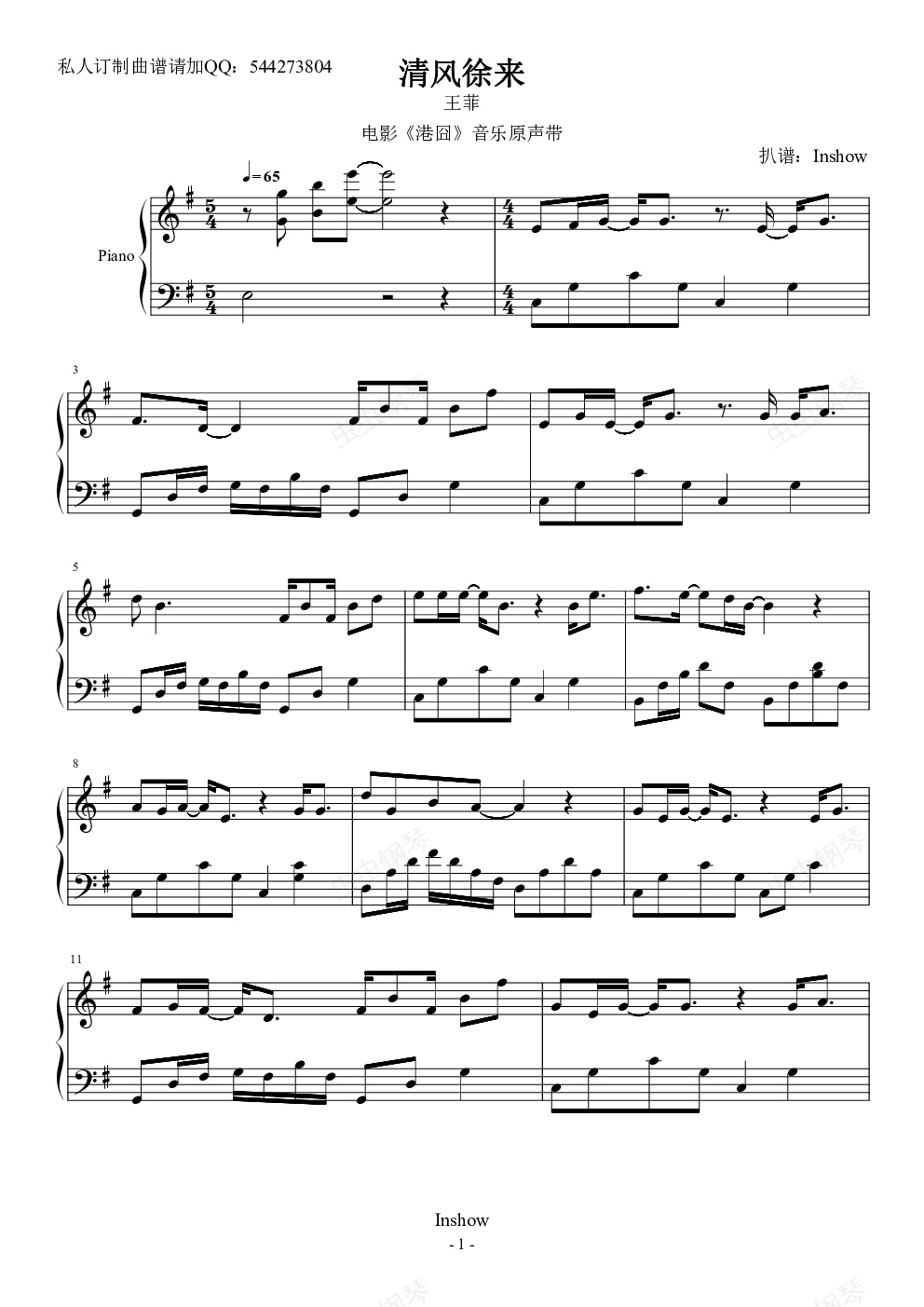 钢琴谱:清风徐来(电影《港囧》主题曲)-王菲