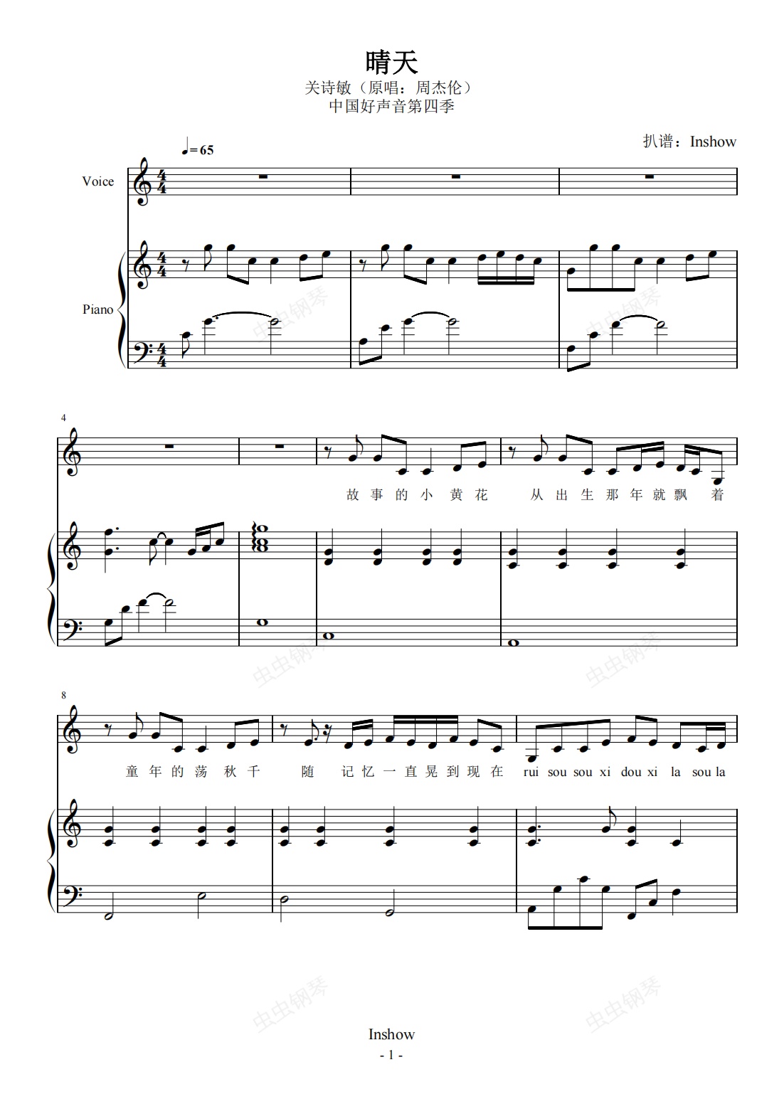钢琴谱:晴天【弹唱】- 关诗敏(原唱:周杰伦) -