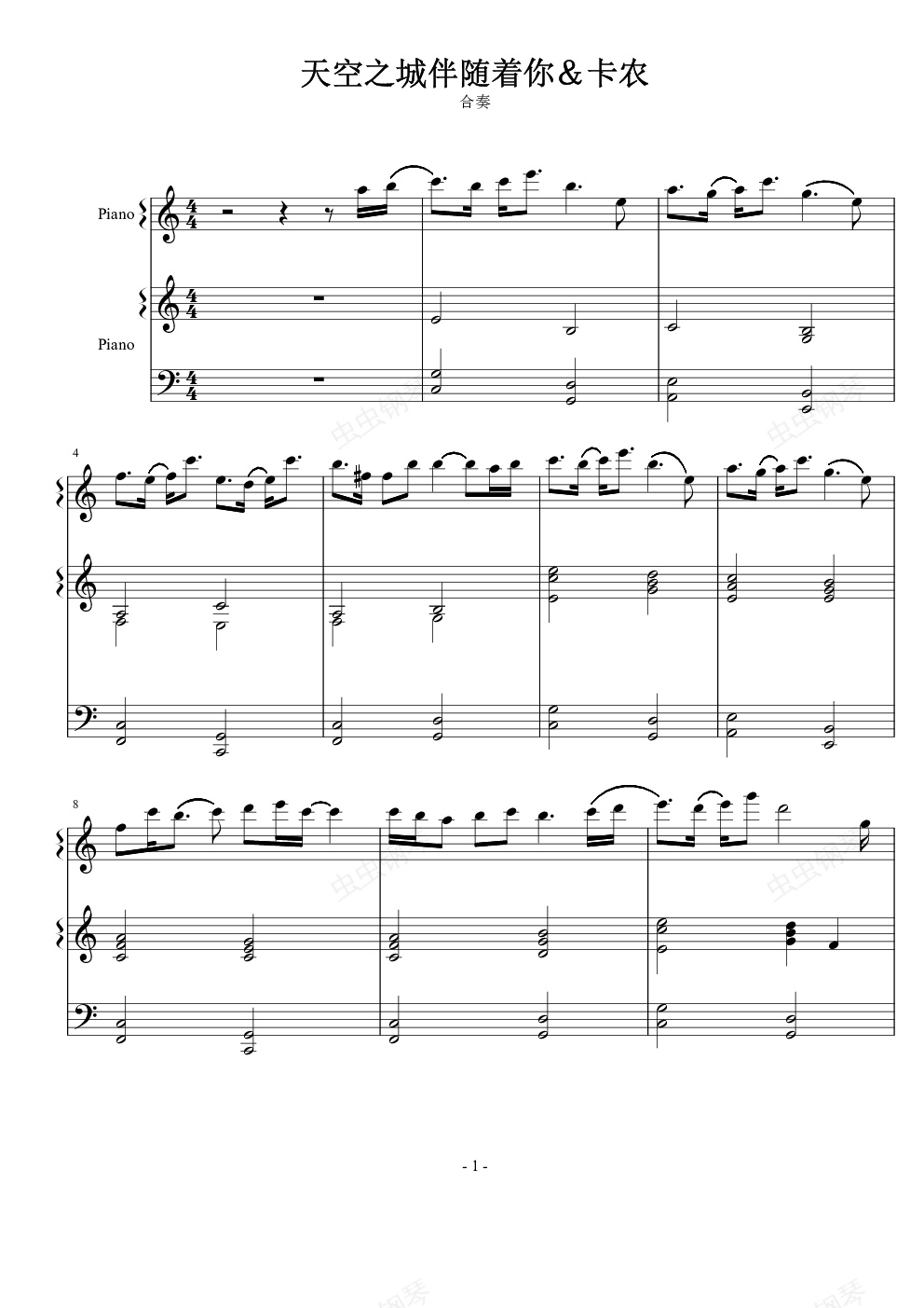 钢琴谱:天空之城伴随着你and卡农 合奏
