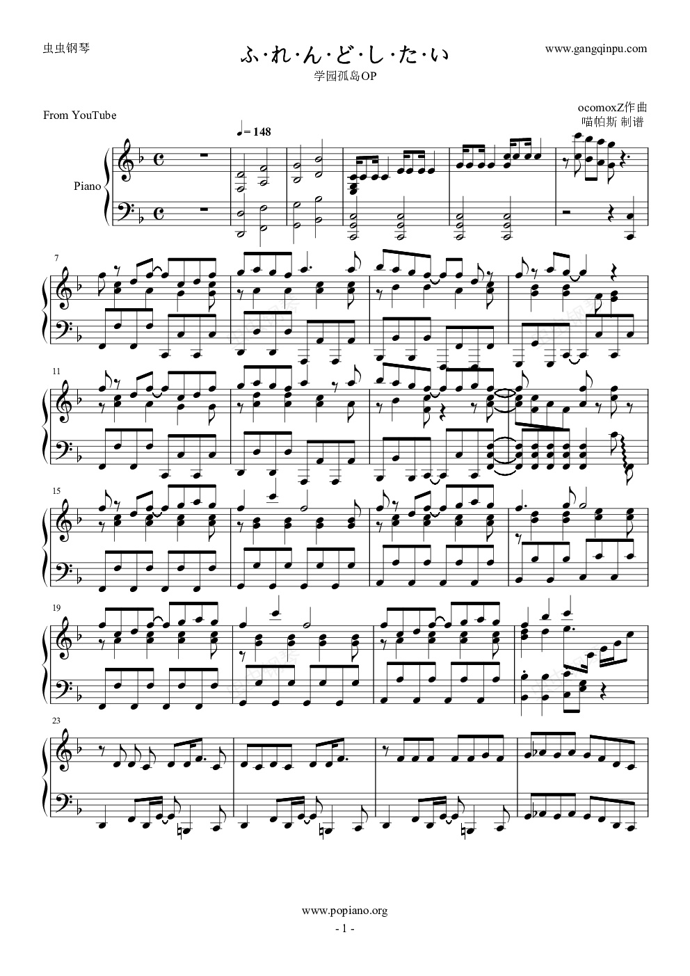 钢琴谱:ふ·れ·ん·ど·し·た·い (想做好朋友-学园孤岛OP)