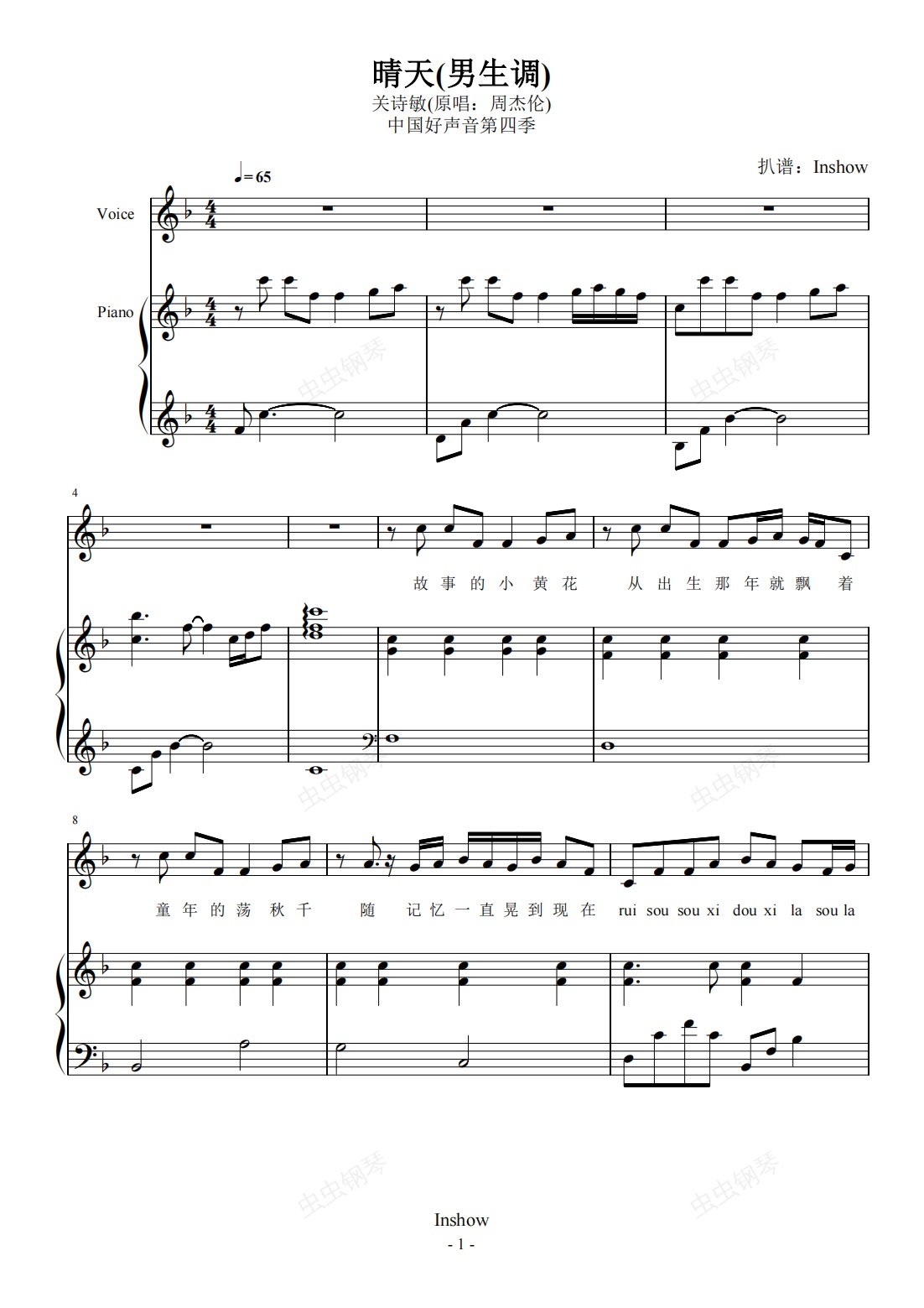 钢琴谱:晴天[男生版]【弹唱】- 关诗敏(原唱:周杰伦) -