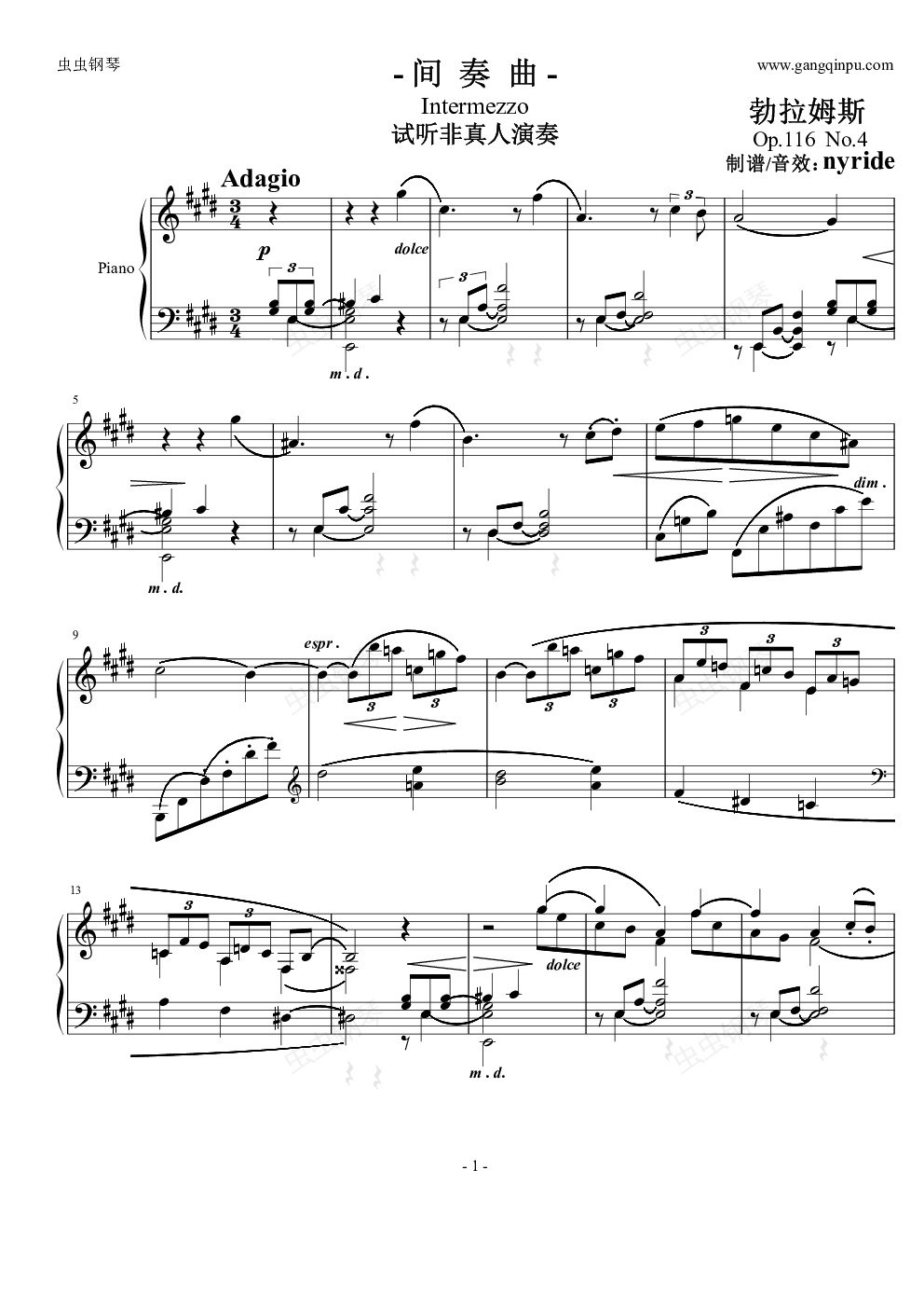 钢琴谱:勃拉姆斯《间奏曲》Op.116 No.4
