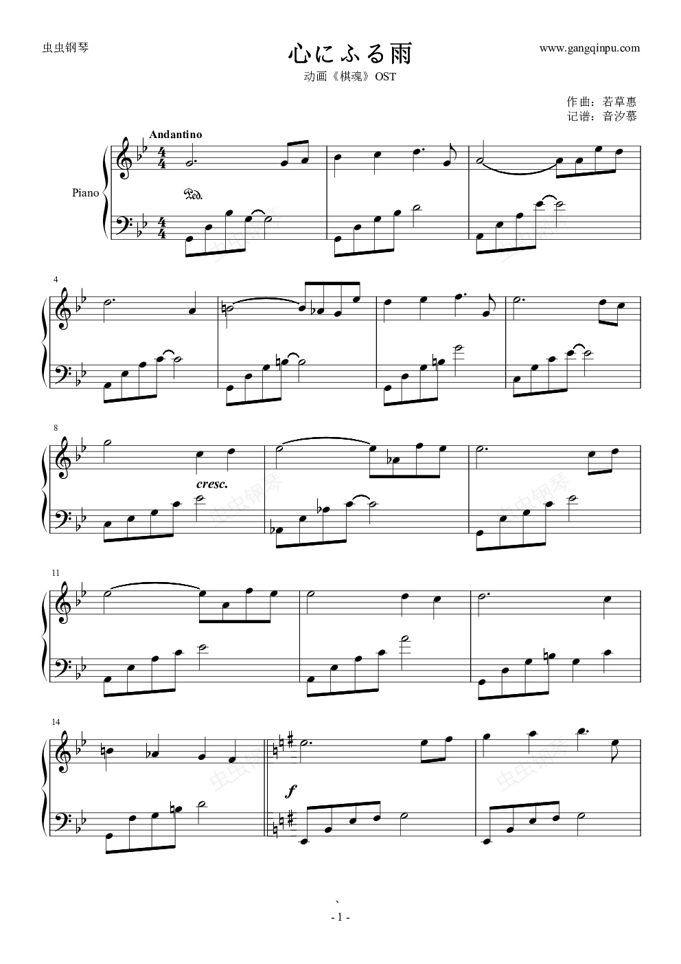钢琴谱:棋魂插曲《心にふる雨》钢琴版