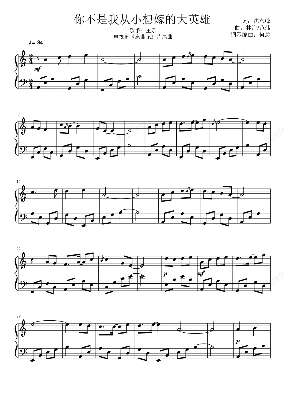 钢琴谱:《你不是我从小想嫁的的大英雄》钢琴谱 新鹿鼎记 片尾曲