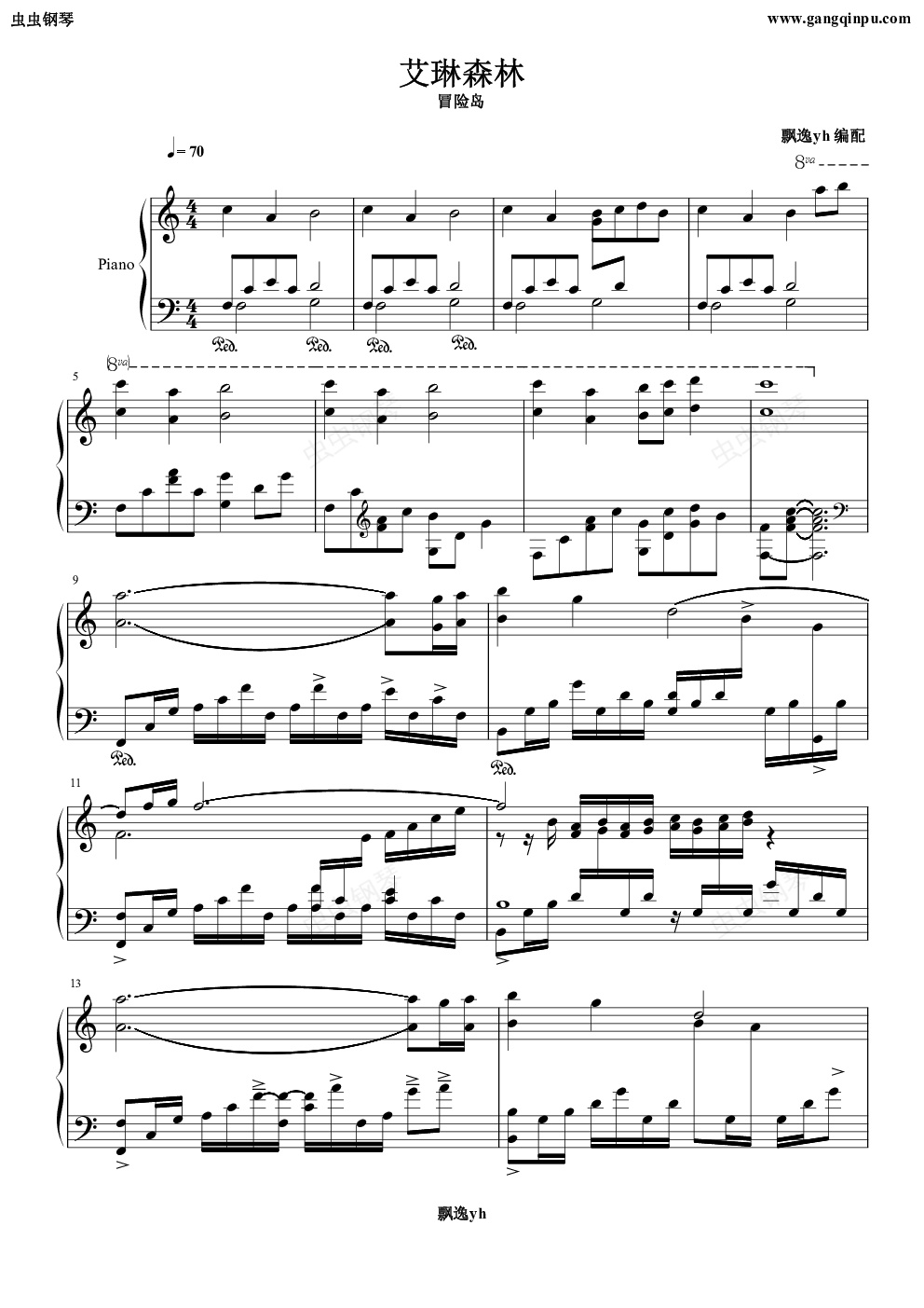 ★下载试听(原版及钢琴版)MP3和MID请移步我的网盘,/e1310★【打印】请点击下方的“PDF格式下载”打开PDF格式乐谱来打印, 否则字和音符都不是特别清楚 有问题可以给我发Email —————————————————————————————————————————————————————————趁着感恩节假期没事做把这首赶出来...不得不佩服给冒险岛配乐的团队,这首基本上只由两个和弦构成,但却营造出了世外桃源的氛围,不过这也导致了改编为钢琴听起来会有点无聊。我尽力了,望包涵→ →通过玩具城赫丽奥斯塔101层可以来到过去的金银岛——艾琳森林。印象最深刻的就是这里的组队任务了...[IMG]/pu/2015/11/27/19556_[/IMG]