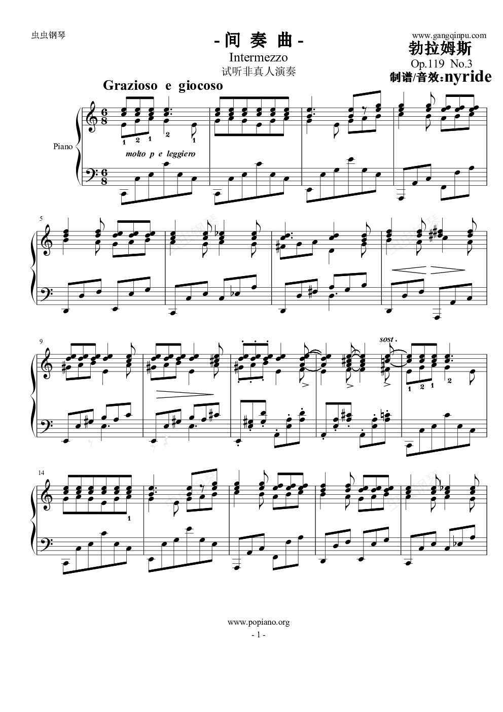 钢琴谱:勃拉姆斯《间奏曲》Op.119 No.3