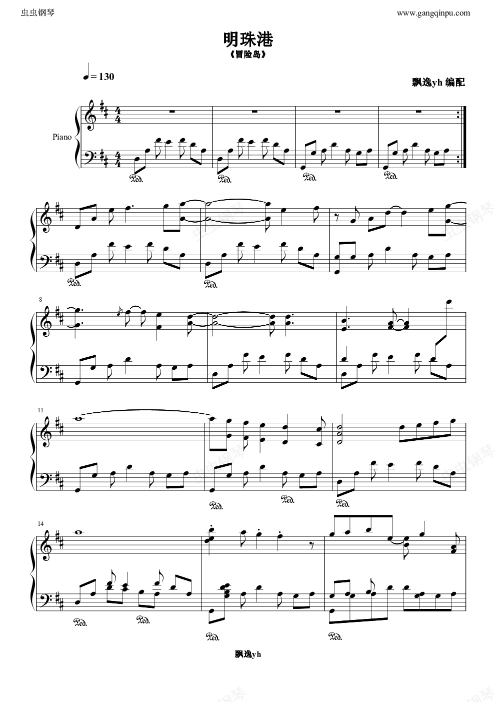 ★钢琴试听非真人演奏★下载试听(原版及钢琴版)MP3和MID请移步我的网盘,/e1310★【打印】请点击下方的“PDF格式下载”打开PDF格式乐谱来打印,否则字和音符都不是特别清楚 有问题可以给我发Email —————————————————————————————————————————————————————————明珠港一定是记忆最深刻的地图之一还记得那些年我们在猪海蹂躏过的各种猪~~左手一直持续着吉他的旋律,象征着冒险旅程永不停歇,后面左手会有别的旋律声部加入进来,可以更突出它们一些。随着音乐,我们起航了......[IMG]/pu/2015/12/28/_[/IMG]