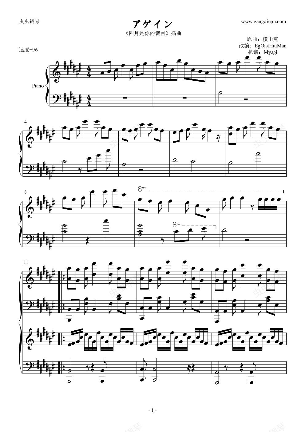 钢琴谱:Again アゲイン(《四月是你的谎言》插曲)