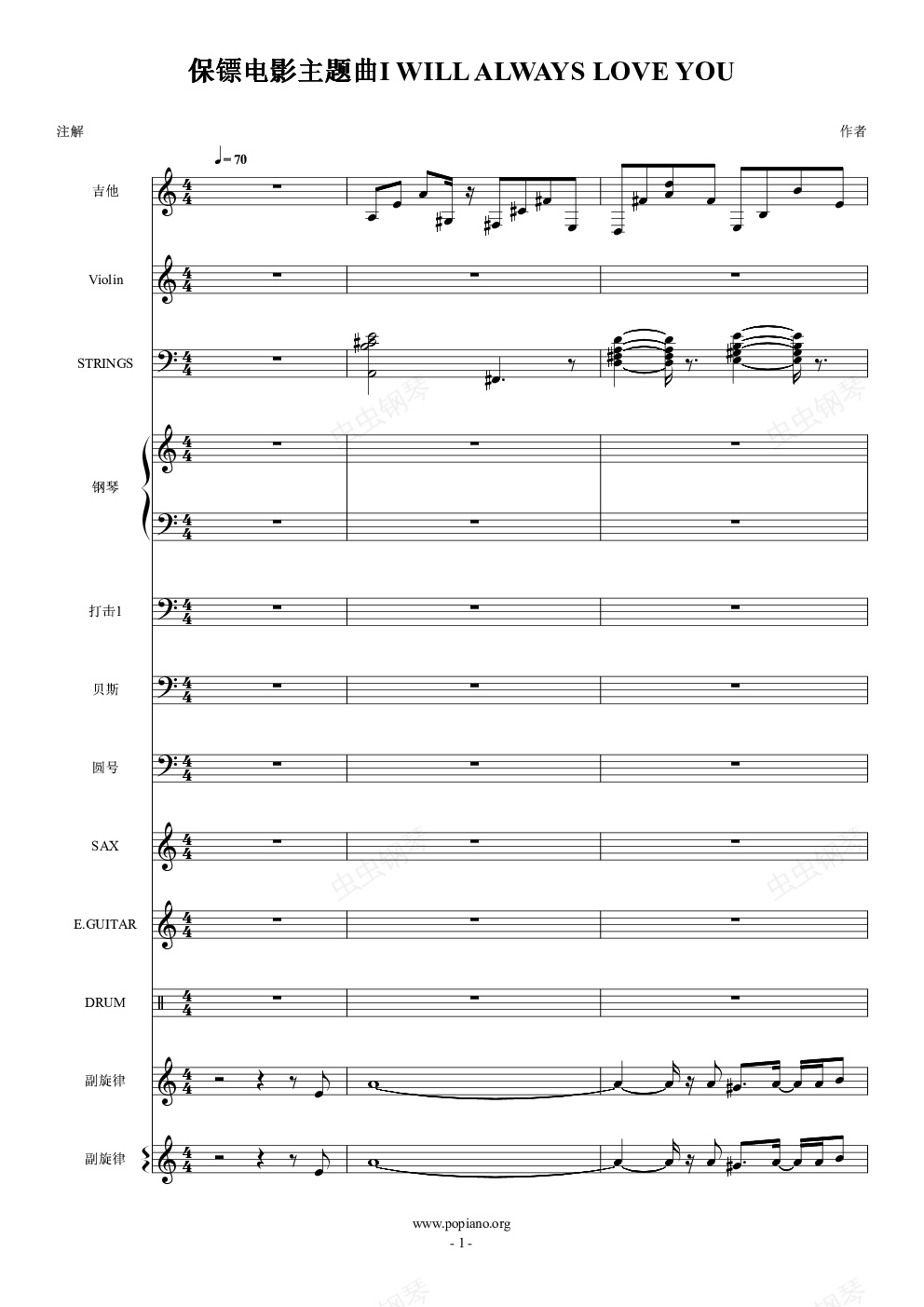 钢琴谱:保镖电影I WILL ALWAYS LOVE YOU