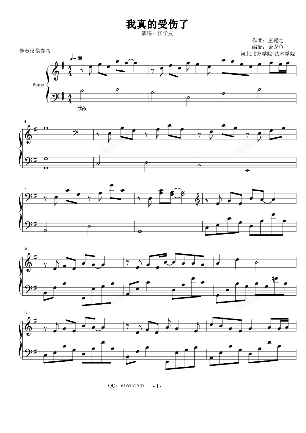 钢琴谱:我真的受伤了-金龙鱼原声版