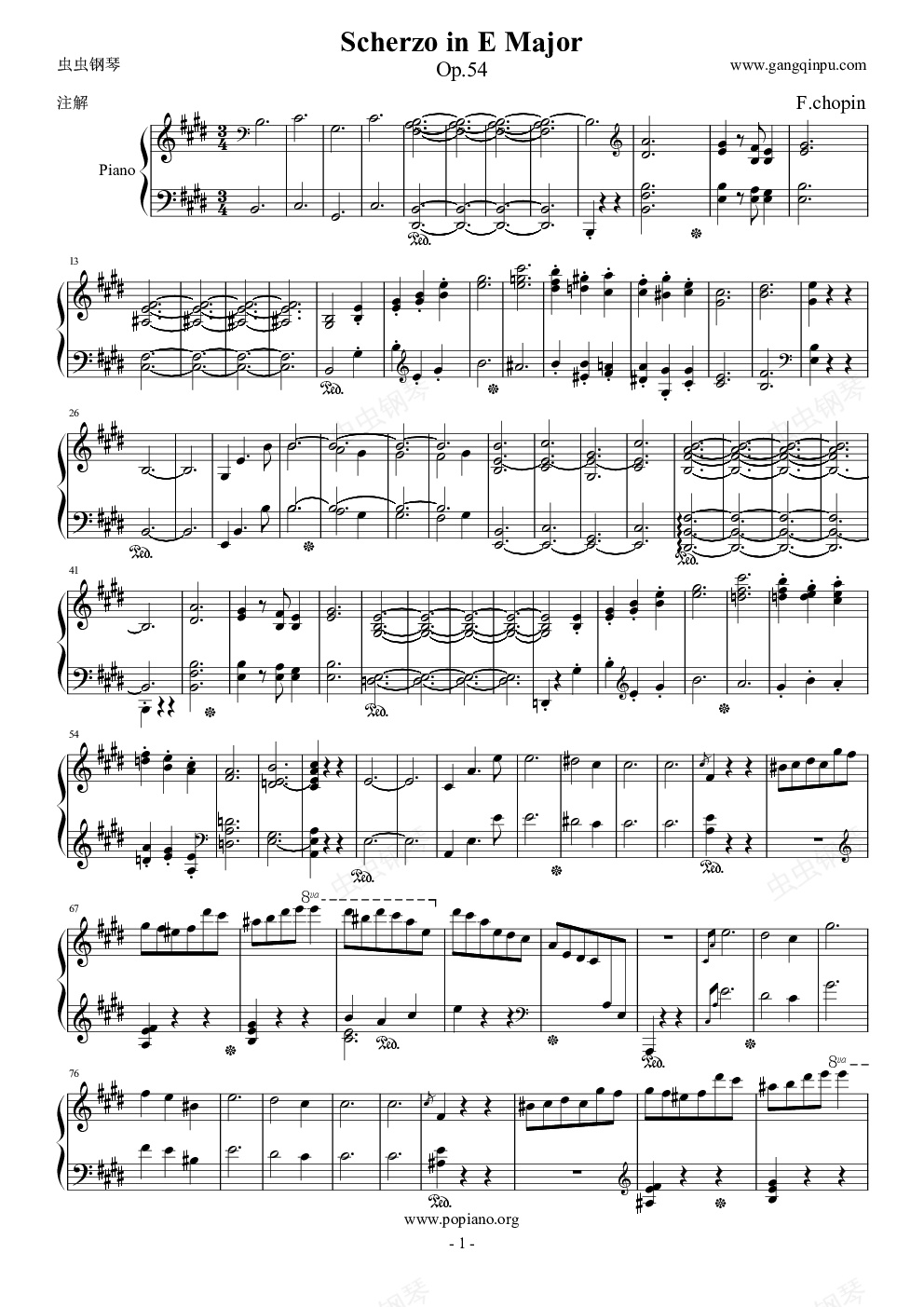 《E大调第四谐谑曲》 No.4 in E Major Op.54 ,作于1842年,献给珍妮?德?卡拉曼小姐。这是肖邦最长的一首谐谑曲,在他的这种体裁的作品中占有特殊地位。肖邦晚年健康每况愈下,但他的精神、感情并不随之虚弱,相反地却相当坚强,这一点可以在他的作品中感觉出来。这首最后的谐谑曲,比他在8年前发表的第一谐谑曲更为优异、轻快,也隐藏着幸福的情绪,奔放而充满喜悦。其乐思单纯、明朗,没有前面三首那样华丽而富于幻想性。乐曲主题和其他谐谑曲一样,为3/4拍的急板,活跃而轻巧,是一连串飞掠疾驰的形象,充满光辉。这是一系列不同的、有时语言难以说明的情绪在相互更替——它们总的情调是明朗的,但抹上了一层“回忆”的忧郁。这是对少年时代的回忆,对那些永不会忘记也用不能返回的一切愉快美好的回忆。中段主题旋律纯朴如歌,非常出色,对于肖邦来说,它有点出乎寻常。这支忧伤沉思的圆舞曲似的旋律,毫无疑问是由生活浪漫曲的音调发展而成的。全部“回忆”情绪的意境以一个短小的结尾结束,这是全曲中最优异的,不论是技巧、内容,都有到达巅峰的感觉,表现出肖邦谐谑曲所特有的、精神奋发的气势。