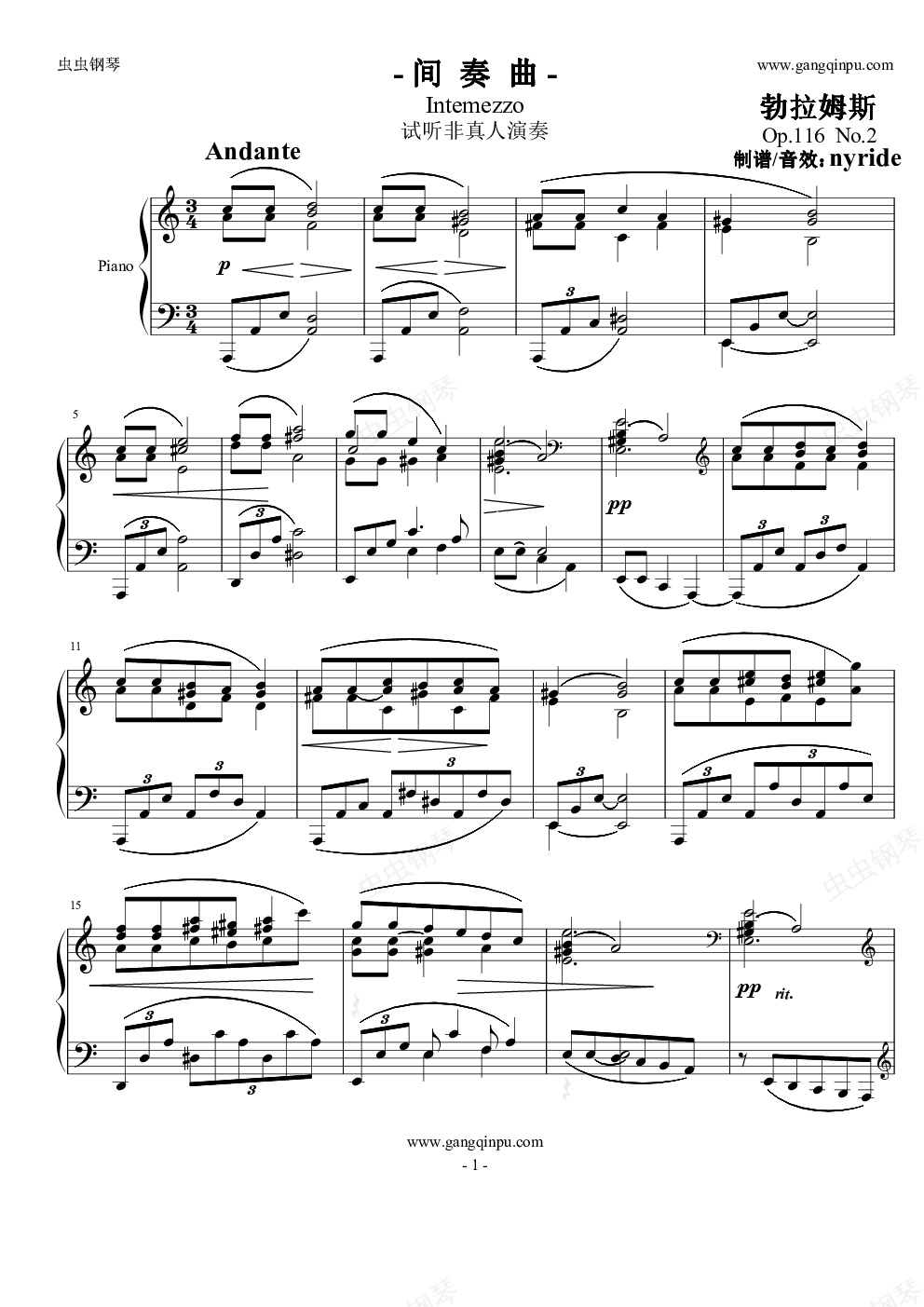 钢琴谱:勃拉姆斯《间奏曲》Op.116 No.2