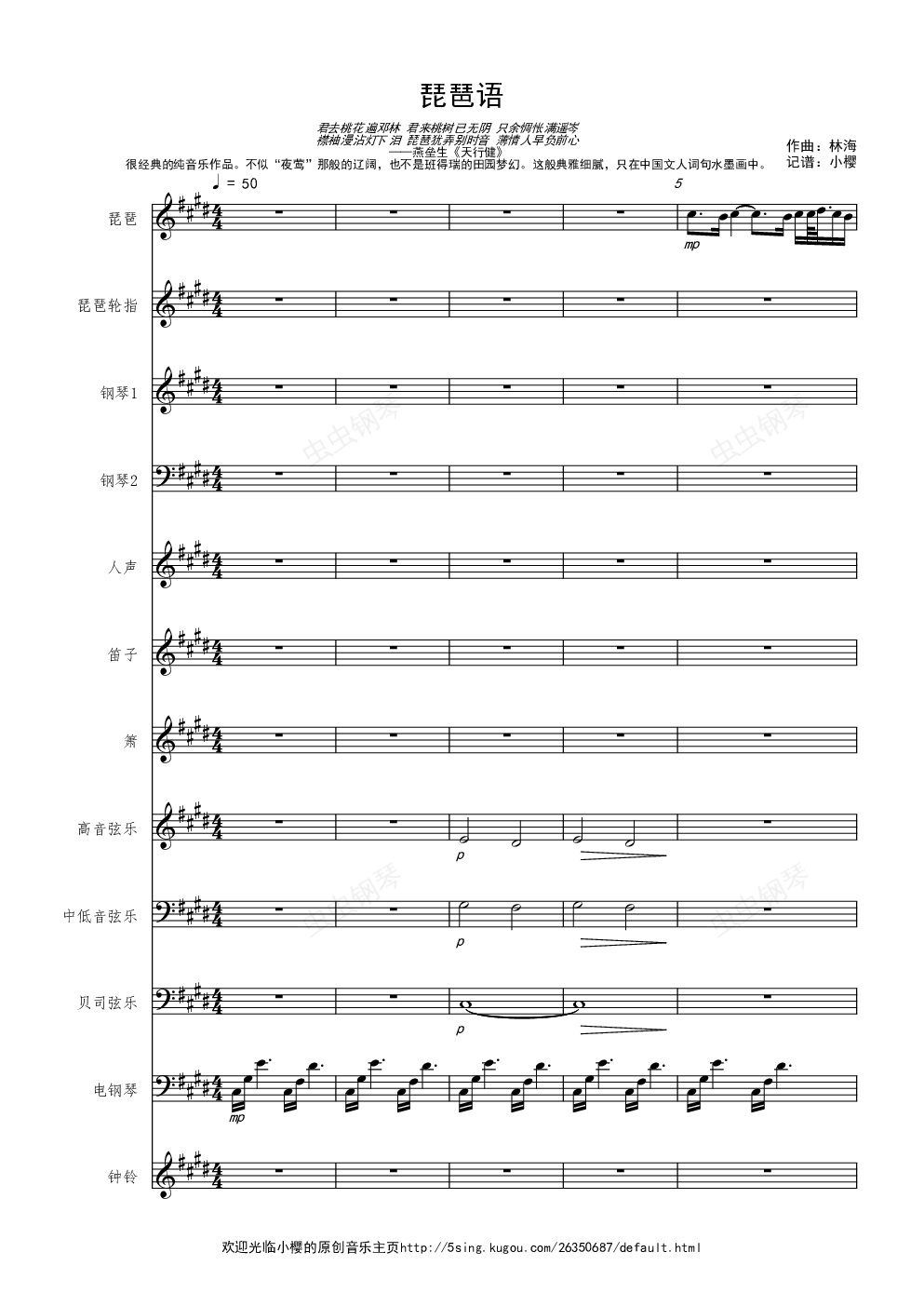 一首很经典的中国纯音乐作品。这份总谱有两处与原版明显不一致;一个是钢琴独奏时的pad铺底没有写,另一个是钢琴的即兴伴奏部分的华彩没有按照原版记录。相关伴奏可以来我的5sing音乐主页下载//