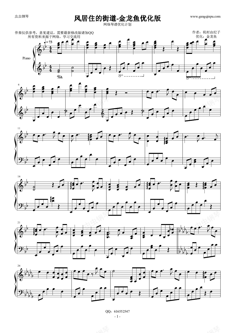 钢琴谱:风居住的街道-金龙鱼优化版