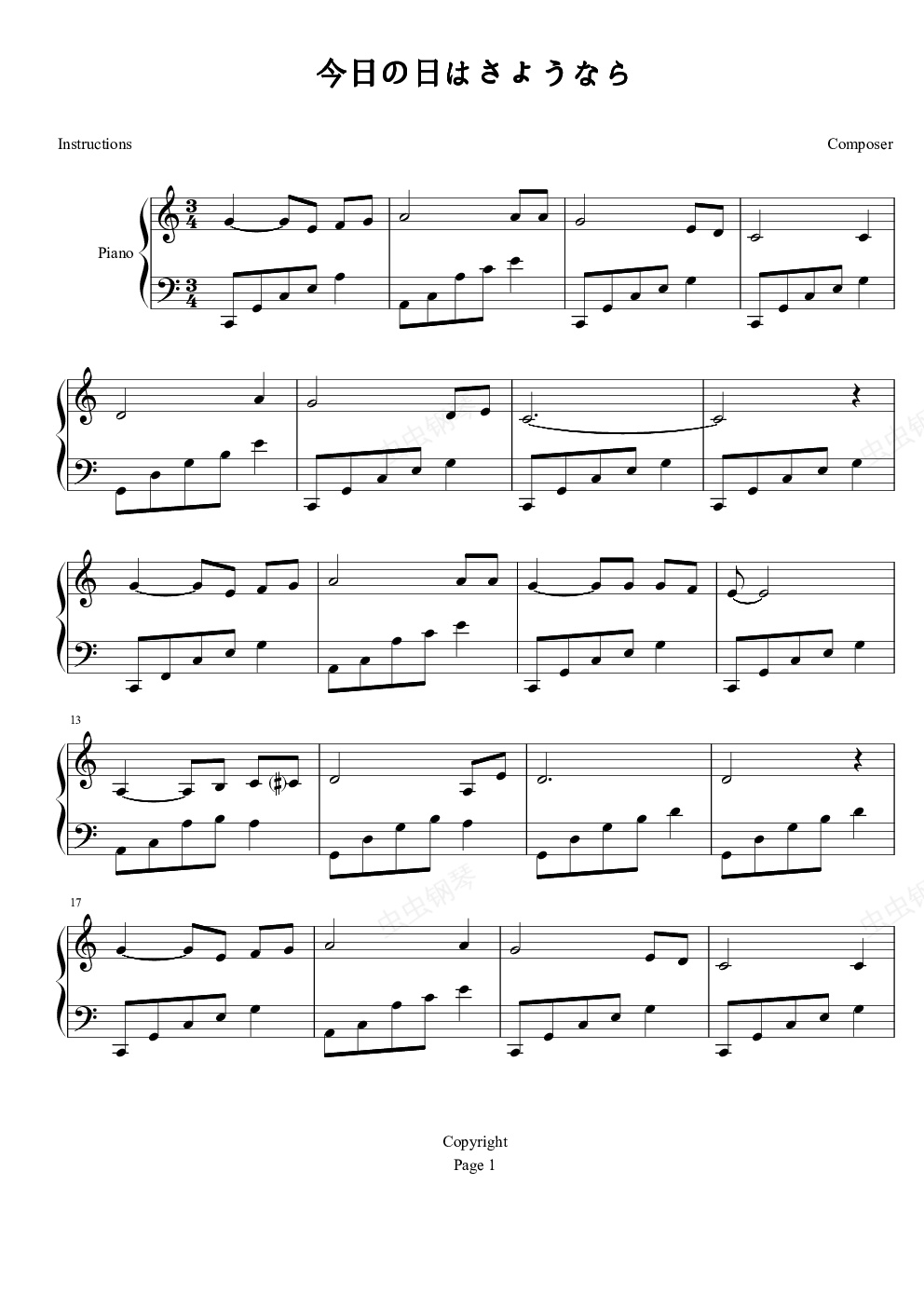 钢琴谱:今日の日はさようなら