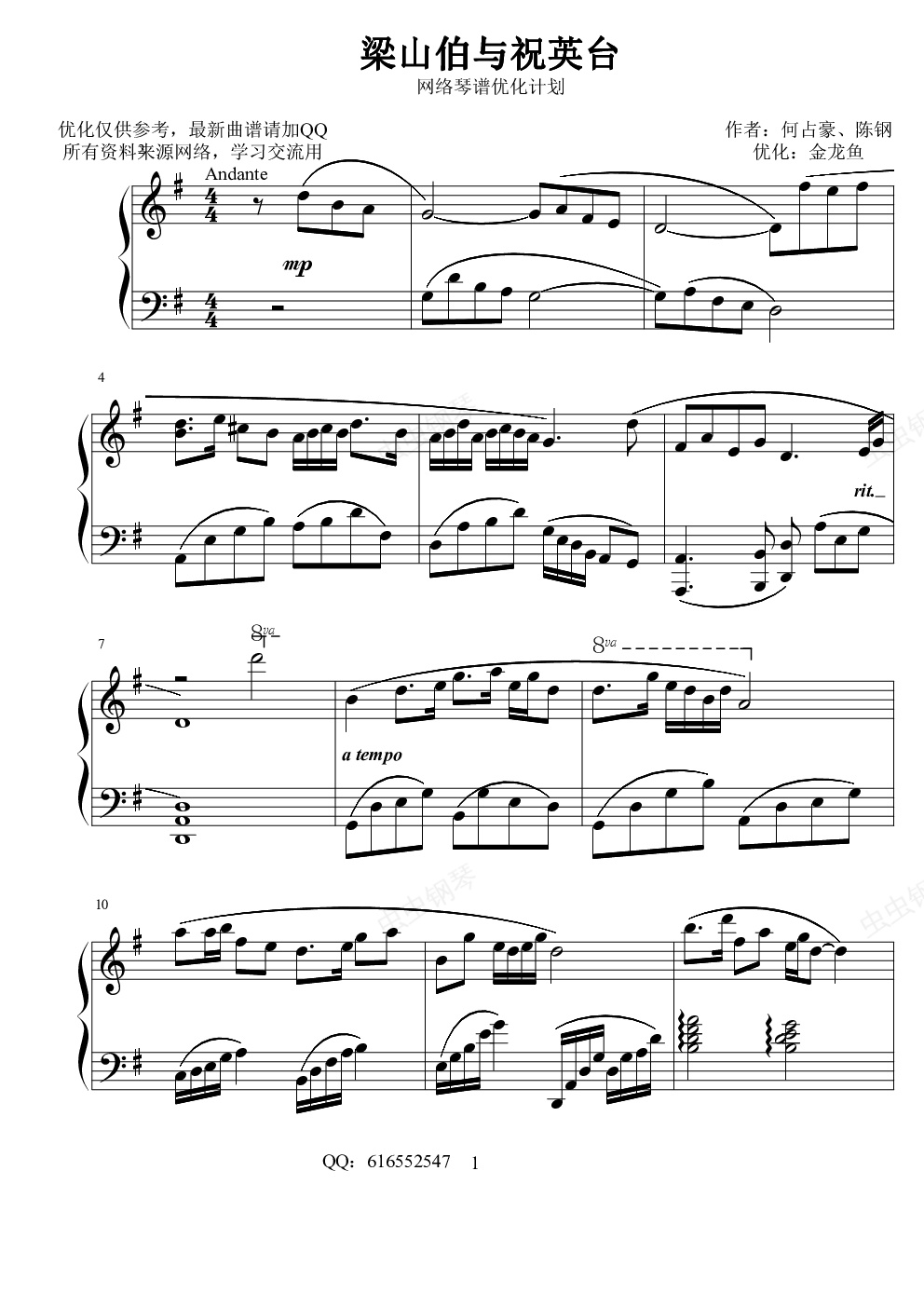 钢琴谱:梁山伯与祝英台-金龙鱼优化版