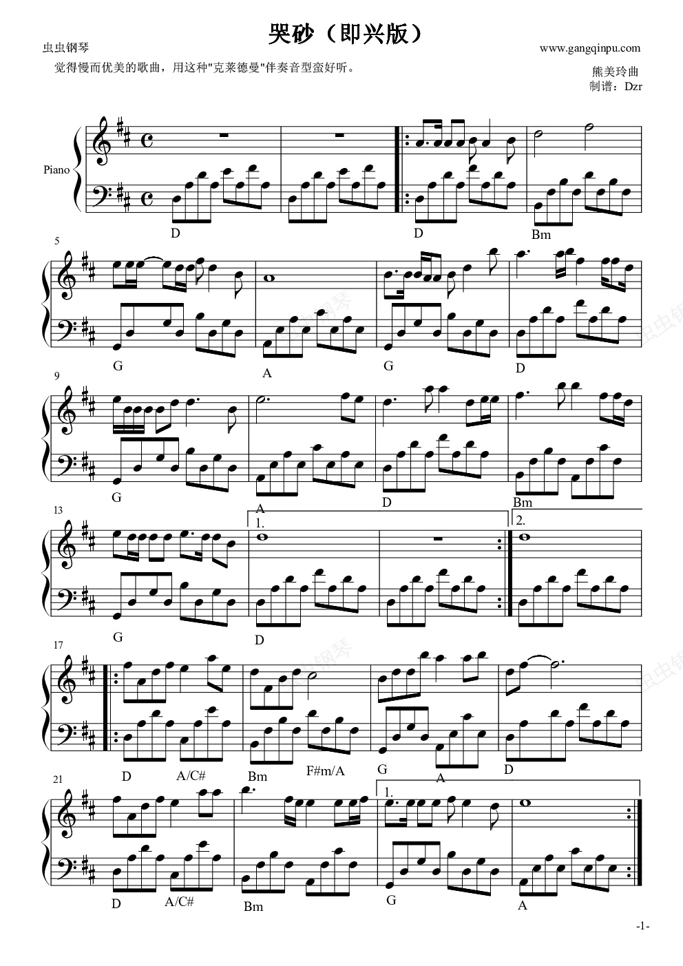 钢琴谱:哭砂(即兴版)