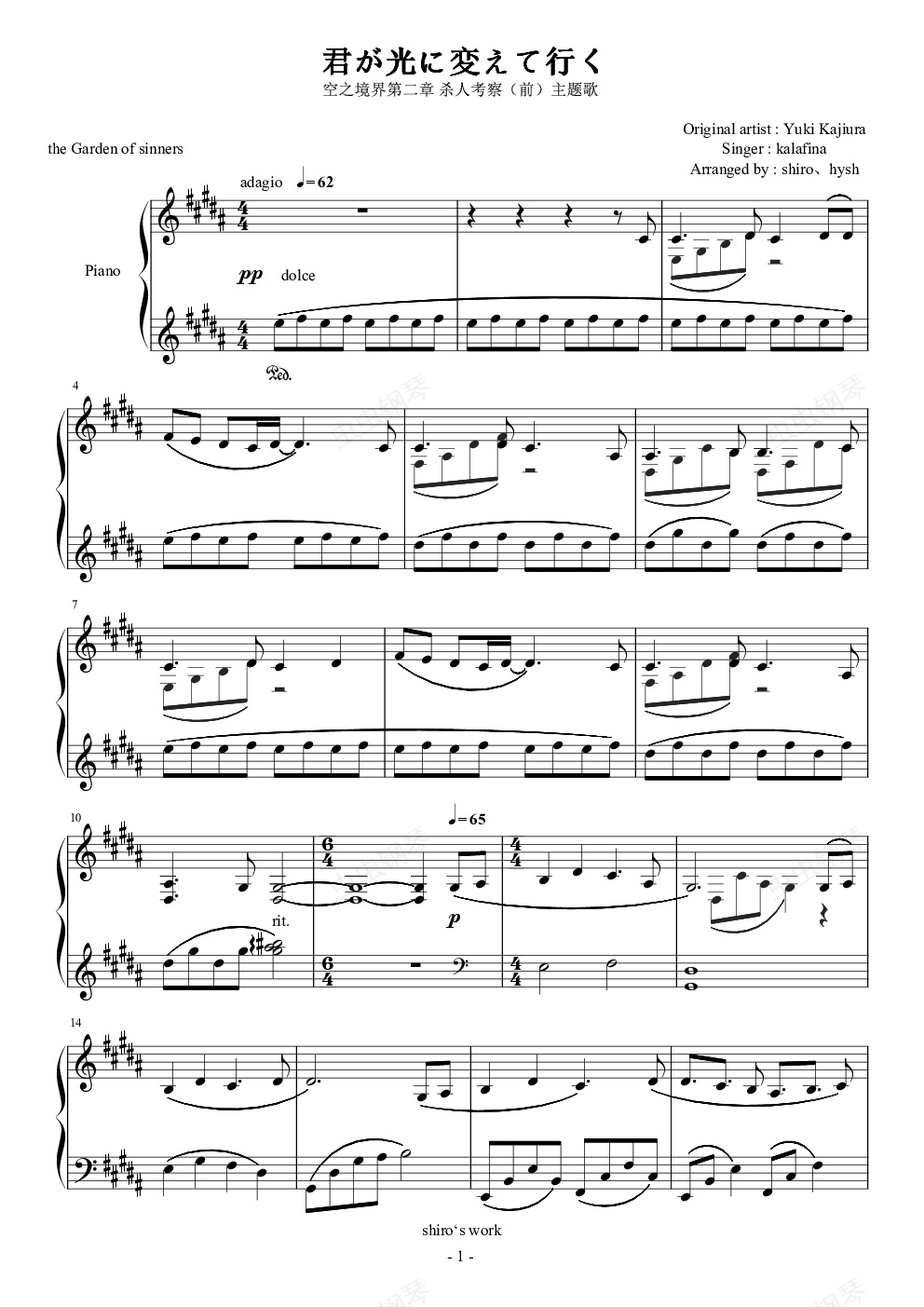 2016.07.16:曲谱有所改动,优化了谱面,修改了部分左手伴奏与右手和弦,使之与原曲更贴近。