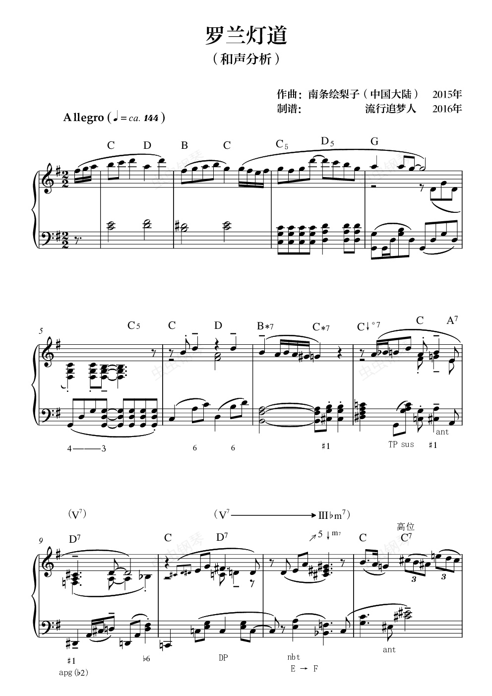 《罗兰灯道》类音乐的和声技法归纳:1.在根音进行上是传统的流行套路,弱化功能强化套路,并且有很多外音装饰。2.和声主要还是高叠和弦为基础,但高度旋律化,和弦的三音、五音、七音常用二度、四度和六度的邻近音自由替代或装饰,最重要的是以四度代替五度和以六度代替七度(注意不同sus4、add6!sus4、add6保留了原五度音程,而这些替代是不保留原音程的,和弦根音有时会因此而产生巧妙的临时变化,正是这种音乐的精髓所在!sus4和add6是传统爵士乐的产物,而代替的四度和六度,是来源于现代作曲家对古典音乐作曲技法的吸收,类似西方传统复调“无旋律,不和弦”的做法,是这种音乐的特色,两者非同名类物,不可混淆!),这些邻音与代音的运用使原来高叠和弦根音与五音间的五度的沉重感被转移释放到了横向声部的运动上,从而在整体上取得一种轻巧、灵动、飘逸的效果。高叠和声的基础内核被完全隐蔽起来以至于不见。(对比Ode to the Stars中则是基于传统爵士乐完全暴露其高叠内核,从而效果沉重而粗糙,跟这类完全是不同的一种风格,然而仍有许多人将二者混为一谈。在自然音体系运用这种技法的有 My Soul Your Beats! OP 等乐曲。)。3.效果性的变音,向下构造的和弦色彩。在后段有少许失谐性装饰,使得音乐的整体效果上带点“故意向混乱过渡”和拟声的意味,但总体音响的过渡还是非常平滑而适中的,其美学取向仍然十分贴近于大众审美。究其来源:这类和声风格在1995~2005年间最盛。原产日本。其根源应是在此年间,日本的影视动漫游戏作曲家吸收西方音乐的印象派(德彪西、拉威尔)和成熟期爵士乐(主要40年代后波普爵士和60年代后的调式、融合与自由爵士)的和声音响特点,把它们与实际创作的场景和日本的民族性审美取向特征结合起来,而形成一种全新的风格。虽然这些作品从风格到形式全都是西方的,从外部几乎看不到日本的痕迹,但在细小的旋律细节以及节奏等整体效果的处理上,仍然凸显出了日本的民族性,如日本文化中对“轻小”物品的审美偏好(可爱特质 - 可愛さ*),以及对“转瞬即逝”的事物的审美偏好(物之哀 - もののあはれ*)等,在现代音乐的创作上折射出对“轻盈飘逸浪漫,又转瞬即逝的”音乐音响的追求,实际从内在精神上蕴含了他们的民族性特点。此外90年代兴起的New Age,后摇滚Funk流行音乐,以及西方有体系音乐中的浪漫派、现代派、简约派的音乐对这些作曲家的创作也有不同程度的影响,具体体现在其调性因素等音乐音响的变换与内在情感的表达上。总体言之,这类音乐风格的影响力和市场份额不可小觑,在盛期之后的十年间日本仍有它的余波,范围广及日本主线的钢琴作曲家松下奈绪等,以及四大同人和三大奇迹,特别是触手猴、Ali和东方等后继者都有受到这种风格模式的不同程度的影响,且它至今仍然不断被日本现代文化共同辐射圈上的国家和地区,特别是中国发达城市的创作者与创作团体所效仿和发展,这种现象主要是由于年轻一代对新生事物的猎奇与对浪漫的或幻想事物的偏好,以及这些国家和地区与日本之间共同的文化渊源以及相似的个人和群体情结。预计今后,这种风格仍然会长期蓬勃发展。