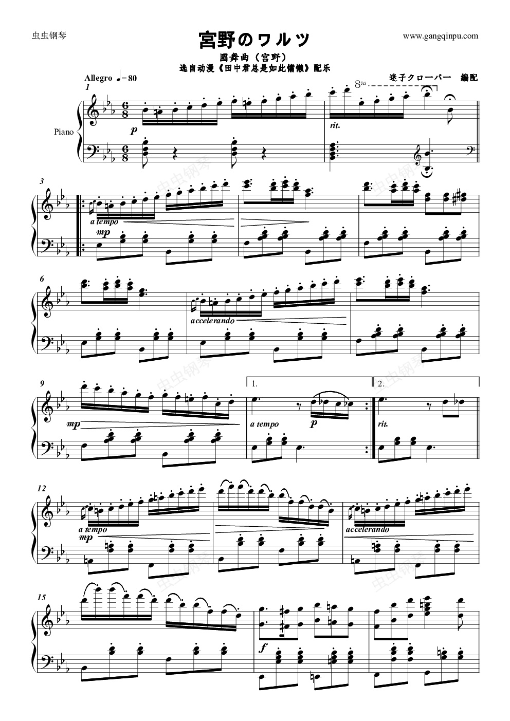 钢琴谱:【田中君总是如此慵懒BGM】宮野のワルツ