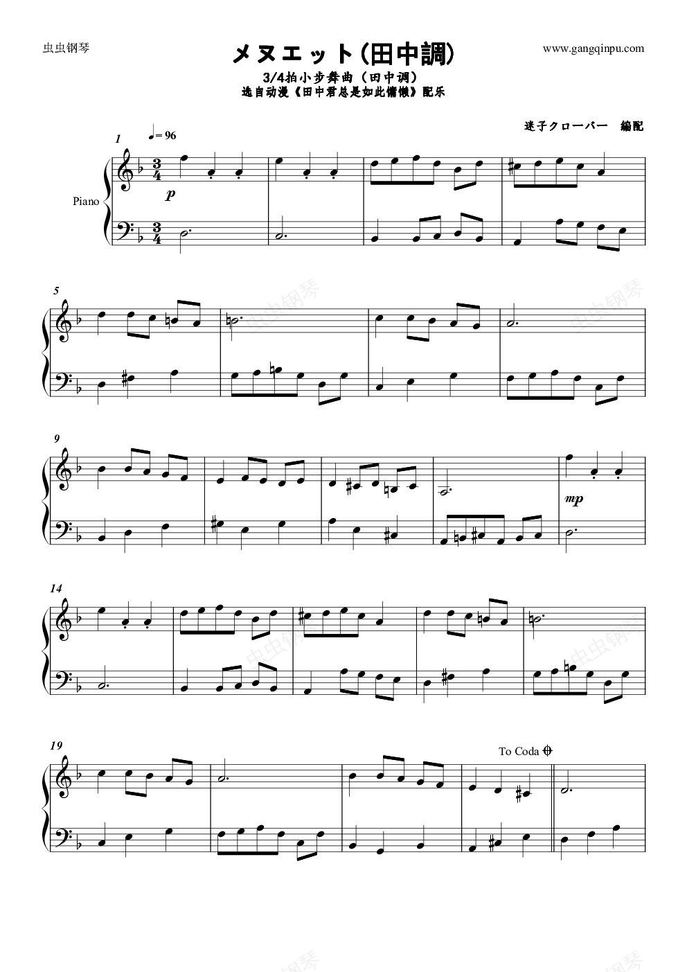 钢琴谱:【田中君总是如此慵懒BGM】メヌエット(田中調)