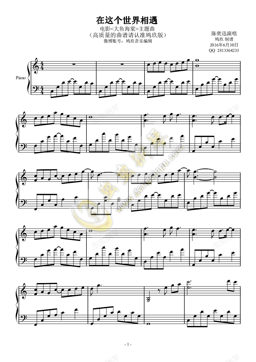 钢琴谱:在这个世界相遇-大鱼海棠主题曲(鸠玖独奏版)