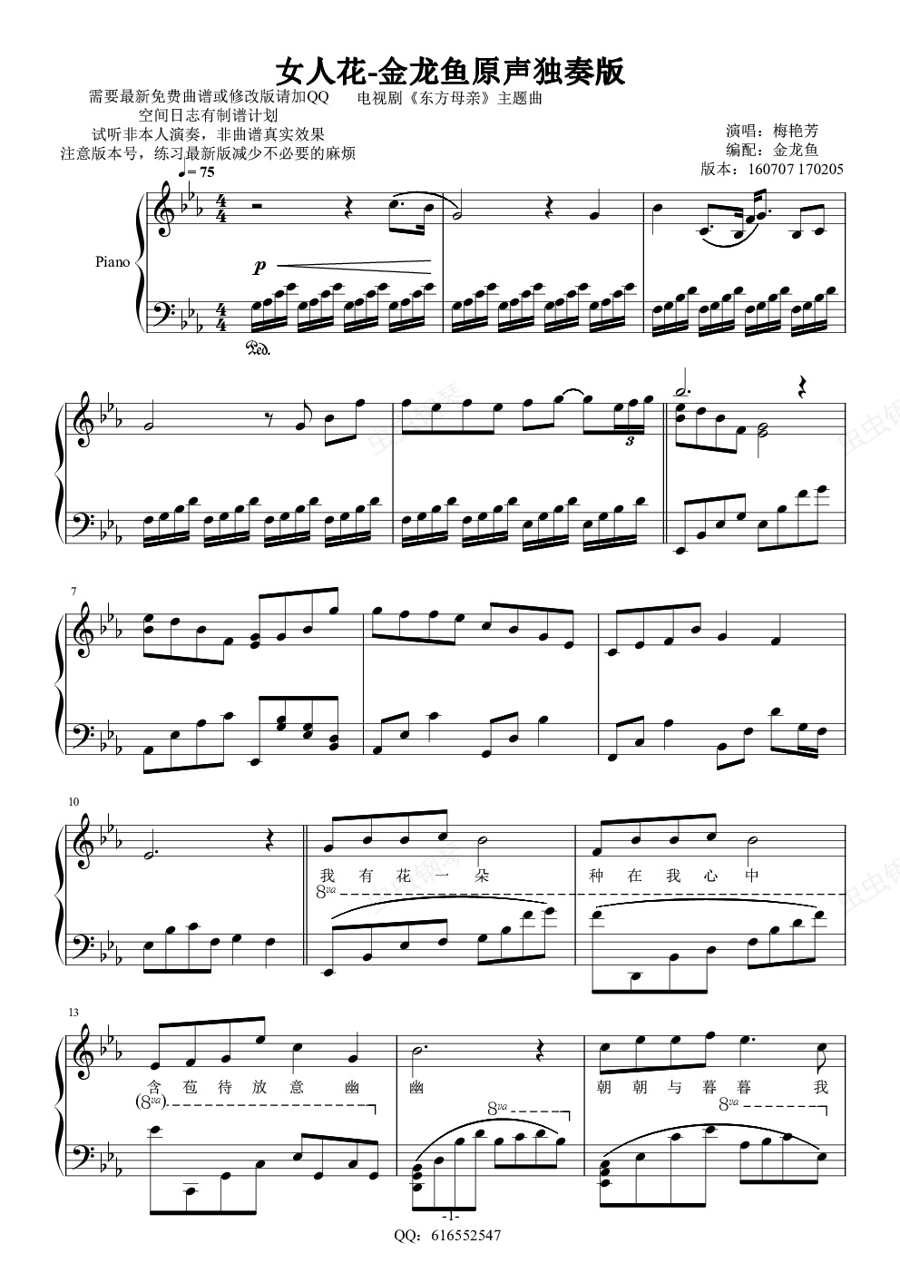 钢琴谱:女人花-金龙鱼原声独奏版170205