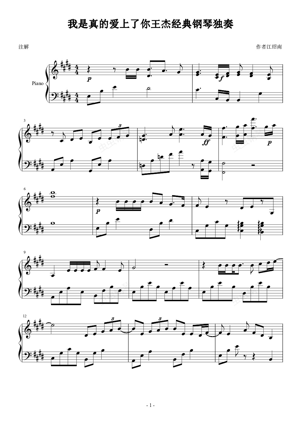 钢琴谱:我是真的爱上了你王杰经典钢琴独奏