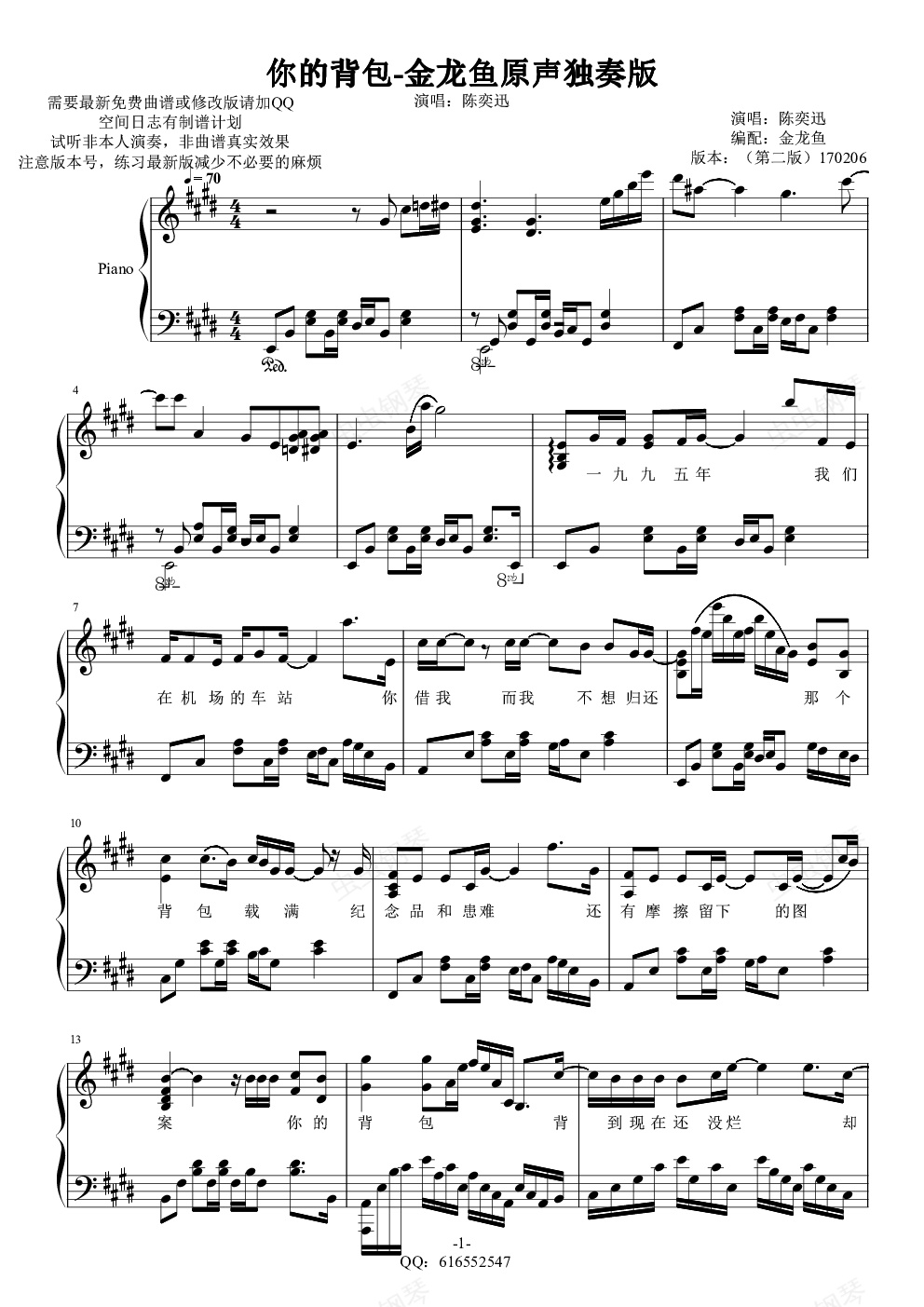 钢琴谱:你的背包-金龙鱼原声独奏版170206