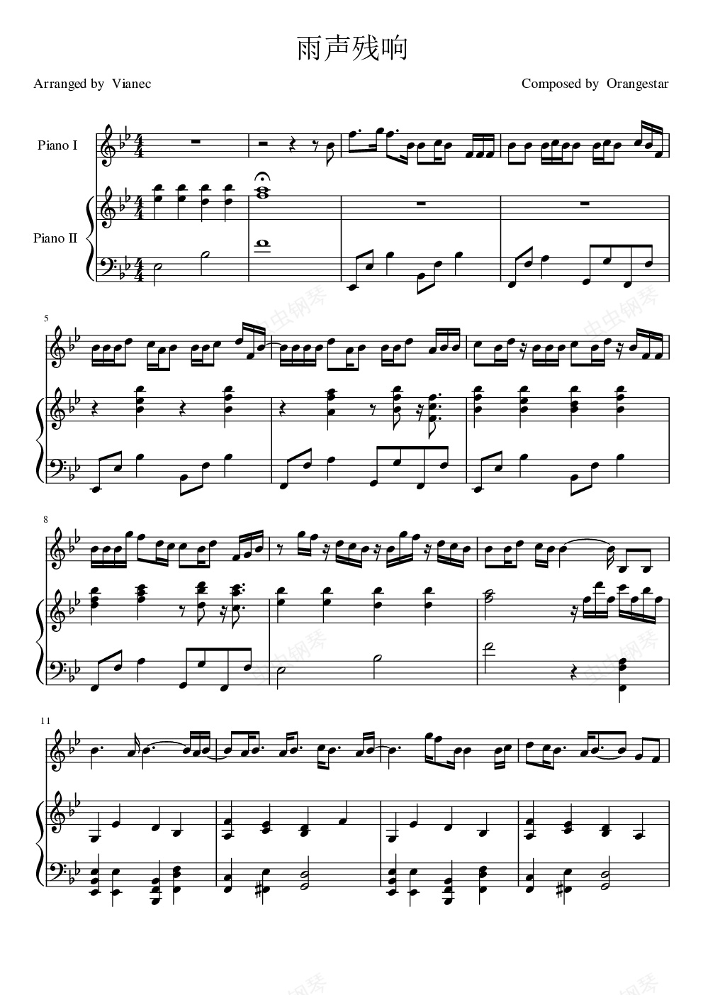 嗨嗨~我又来传【黑椒】的谱子啦,这次是雨き声残響,以下是黑椒本人让我帮他传达哒【黑椒】:很喜欢这首曲子 特别是版本的 然后看见网上关于这首曲子的谱子都不容易找或者找不着 所以就编了这个谱子 结尾处与原来略有改动 传达完毕啦,希望各位喜欢啦0w0 PS:原声试听并不是IA的原唱,而是蛇叔的翻唱