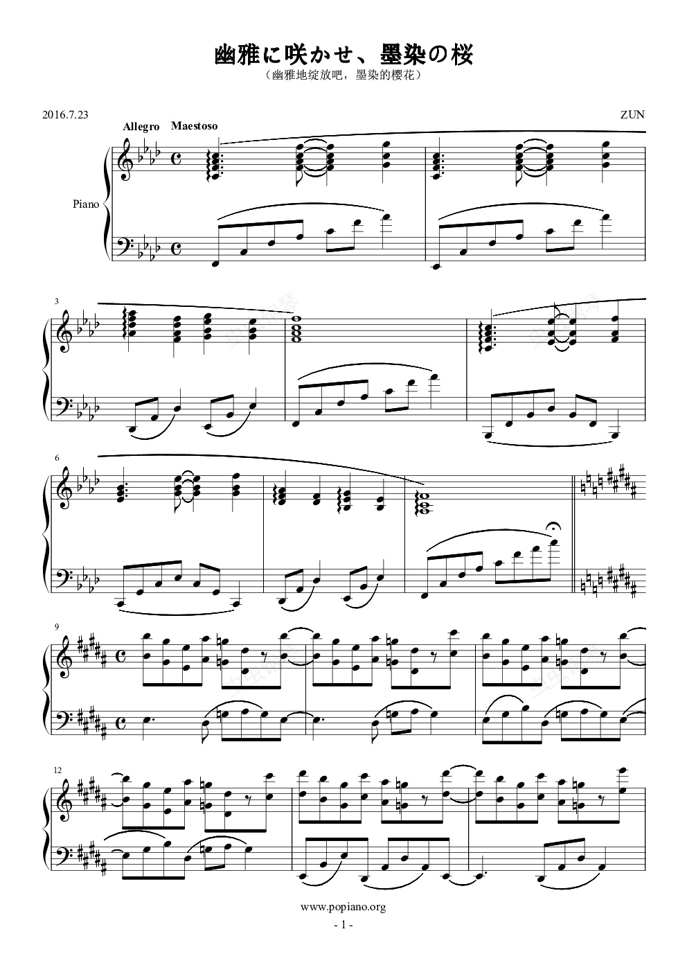 钢琴谱:【东方妖妖梦】幽雅地绽放吧,墨染的樱花