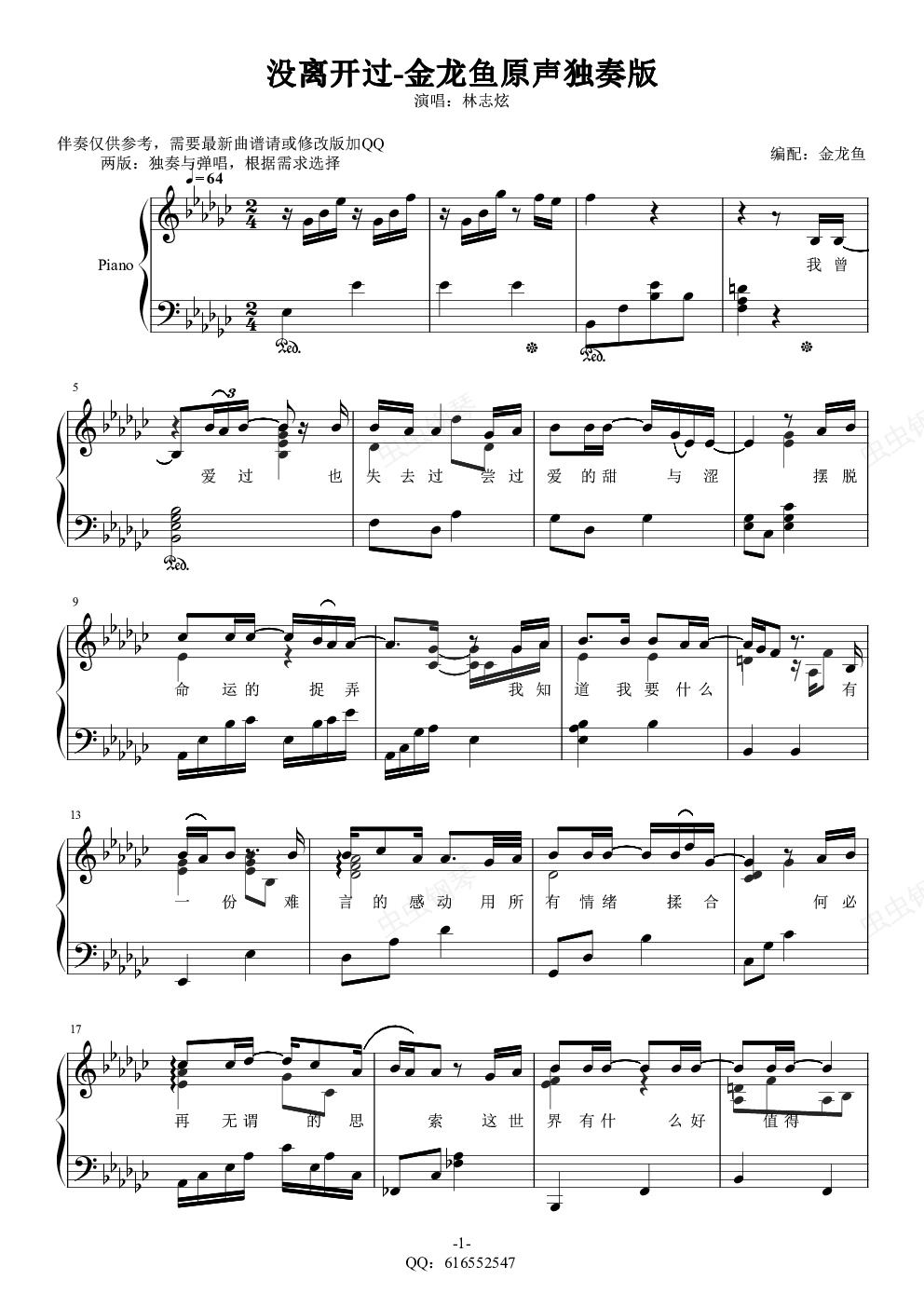 钢琴谱:没离开过独奏-金龙鱼原声版