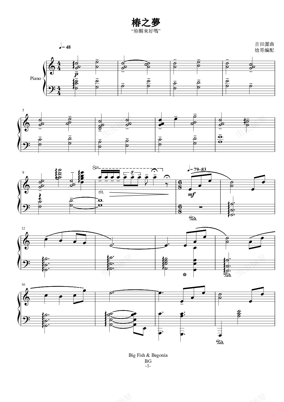 大鱼海棠某插曲,大概出现在男主角将椿从鼠婆山洞救出抬回荒楼男主的独白,椿的梦那里。话说这个歌名不会就叫椿の梦吧,等知道了歌名再改回来。历经四刷还是觉得很棒,此处安利一下,如果影院还没下线又没看过的还是很推荐去看一下的。PS:不要看成一个三角恋的故事PS2:认真的扒下此歌,想要把全片从头到尾的音乐扒下做组曲这样就可以听着歌就能回味剧情真棒呢。估计真的做了的话只有这首歌质量是最高的。[IMG]/pu/2016/7/31/__7594__[/IMG]分割线———————————————————————————果断买下了数字版不知道实体版什么时候出呢!不知道为什么音频上传的时候总是出错分割线-——————————————————很多小伙伴吐槽左手跨不来,你把跨不来的左手冠音放到右手来弹就是一个八度的事情……唯一跨不来的是最后一个小节的第一个音那里左手应该没有音但是我怕再改了谱音频又给我传错了……大家互相转告之……_)_——+———————+——+——+——+——+——修改了记谱还有一些错误希望音频不要传错·请管理员修改一下这个网站的评论机制,普通两句话就被认为灌水违禁,根本无法发言。
