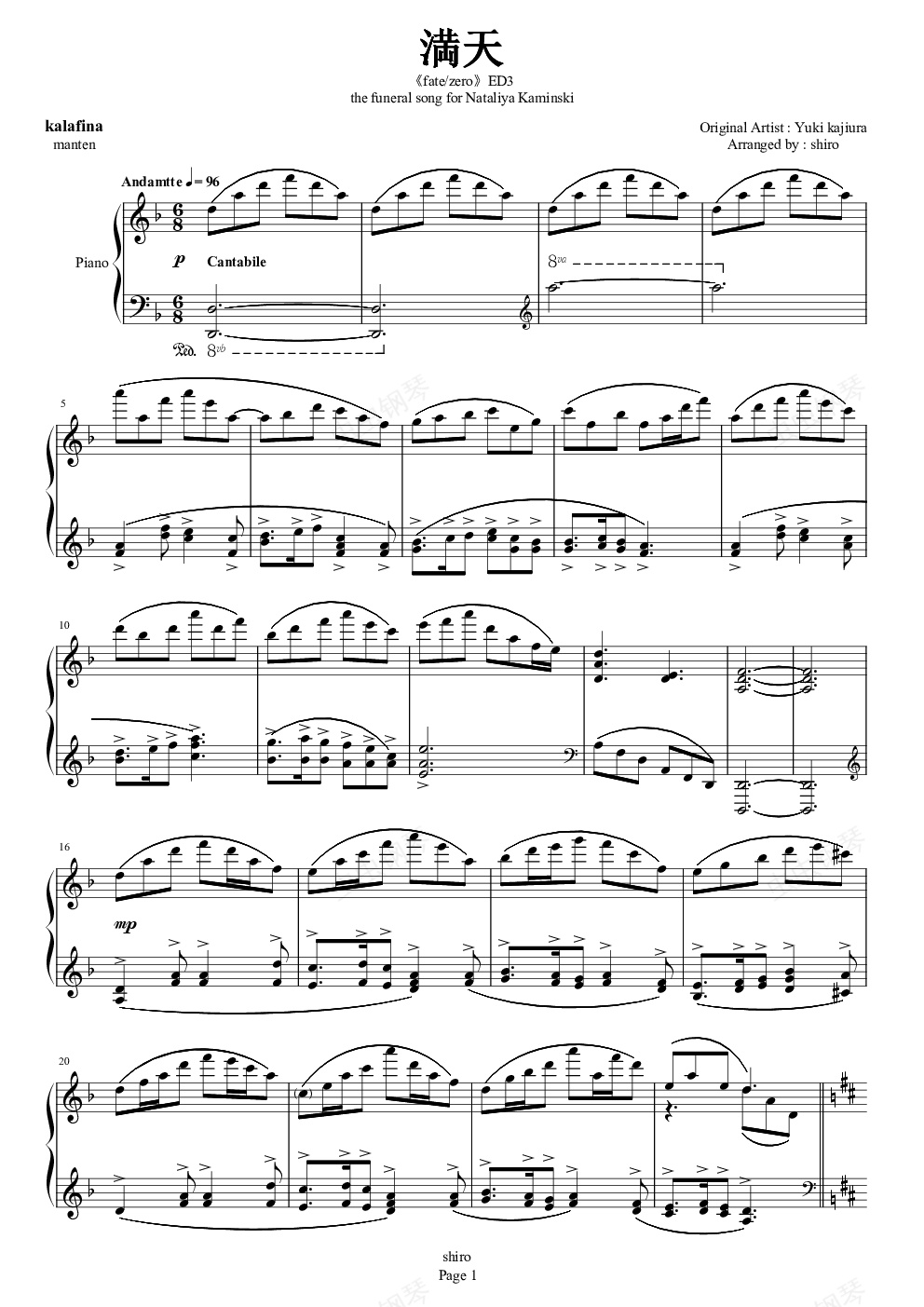 [IMG]/pu/2016/8/1/__6575_03710_[/IMG]  前一阵子重温FZ的时候再一次被切嗣papa给震撼了,一个人选择背负所有的罪恶,牺牲自己心爱的人,只为拯救更多的人却还不被世人理解,那种孤独悲伤的心情配合K团的这首满天让我不禁泪目......于下定决心编一下这首。    由于后面高潮部分和部分演奏技巧参考了一下前辈们的版本,所以为了表示对前辈们的敬意,我把两位前辈的版本也贴出来,这里没有冒犯前辈们的意思啊。。。毕竟我的目标是超越前辈们!(尽管我觉得不太可能/(ㄒoㄒ)/)  ------------------------------------------------------------  Luu前辈的版本:/html/  秋崖前辈的版本:/html/    最后还是希望管理员大大,不要改动我的谱面,直接做PDF就好啦!    -----------------------------------------------------------    2016.12.24曲谱更新:更新谱面,更换试听。。。。。。