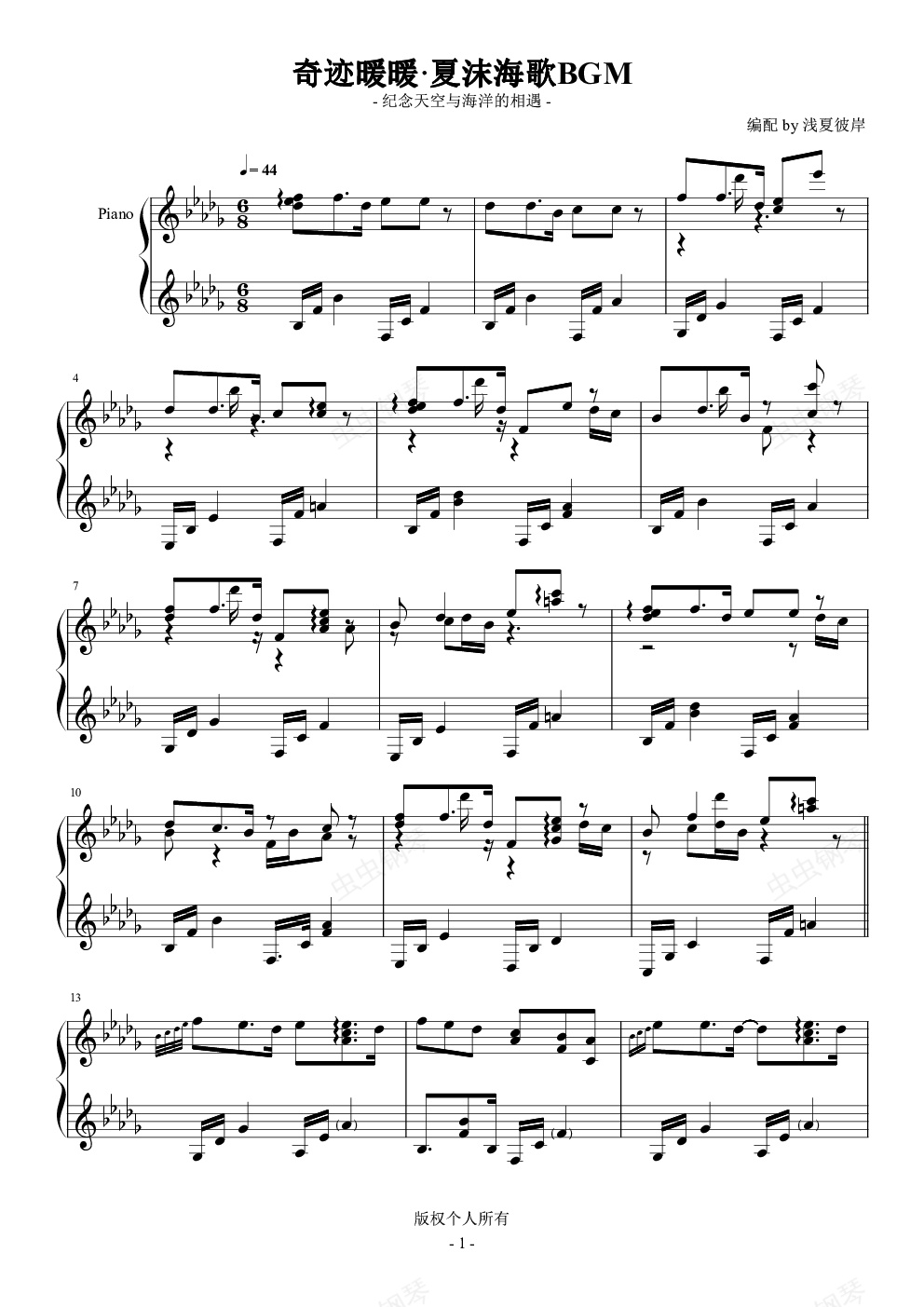 钢琴谱:奇迹暖暖·夏沫海歌BGM