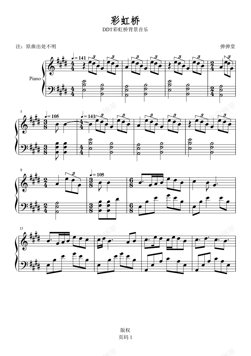 钢琴谱:弹弹堂彩虹桥背景音乐