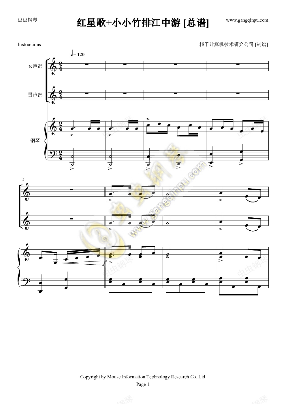 钢琴谱:红星歌+小小竹排江中游