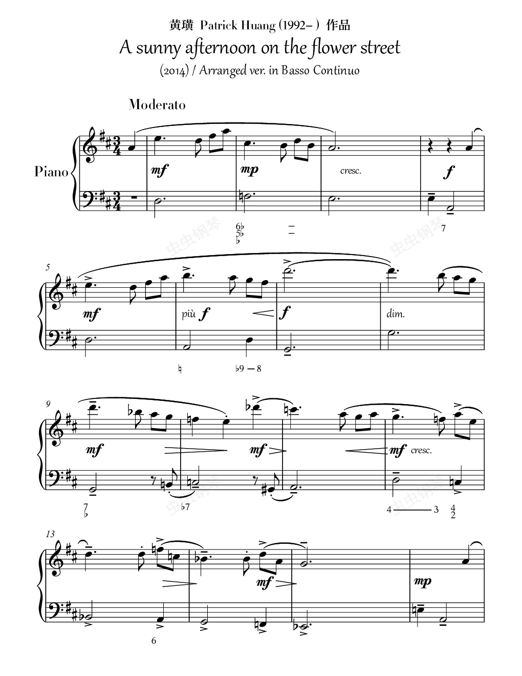 这首作品的和声虽然属于浪漫,但思维暗合于巴洛克时期通奏低音(数字低音)的方式。变音方面,基本上将数字低音的所有记号都包含了,因此,这首作品也是有需要者练习演奏数字低音的极佳素材。这个版本即将当中的和声全部提取为数字低音后所得。