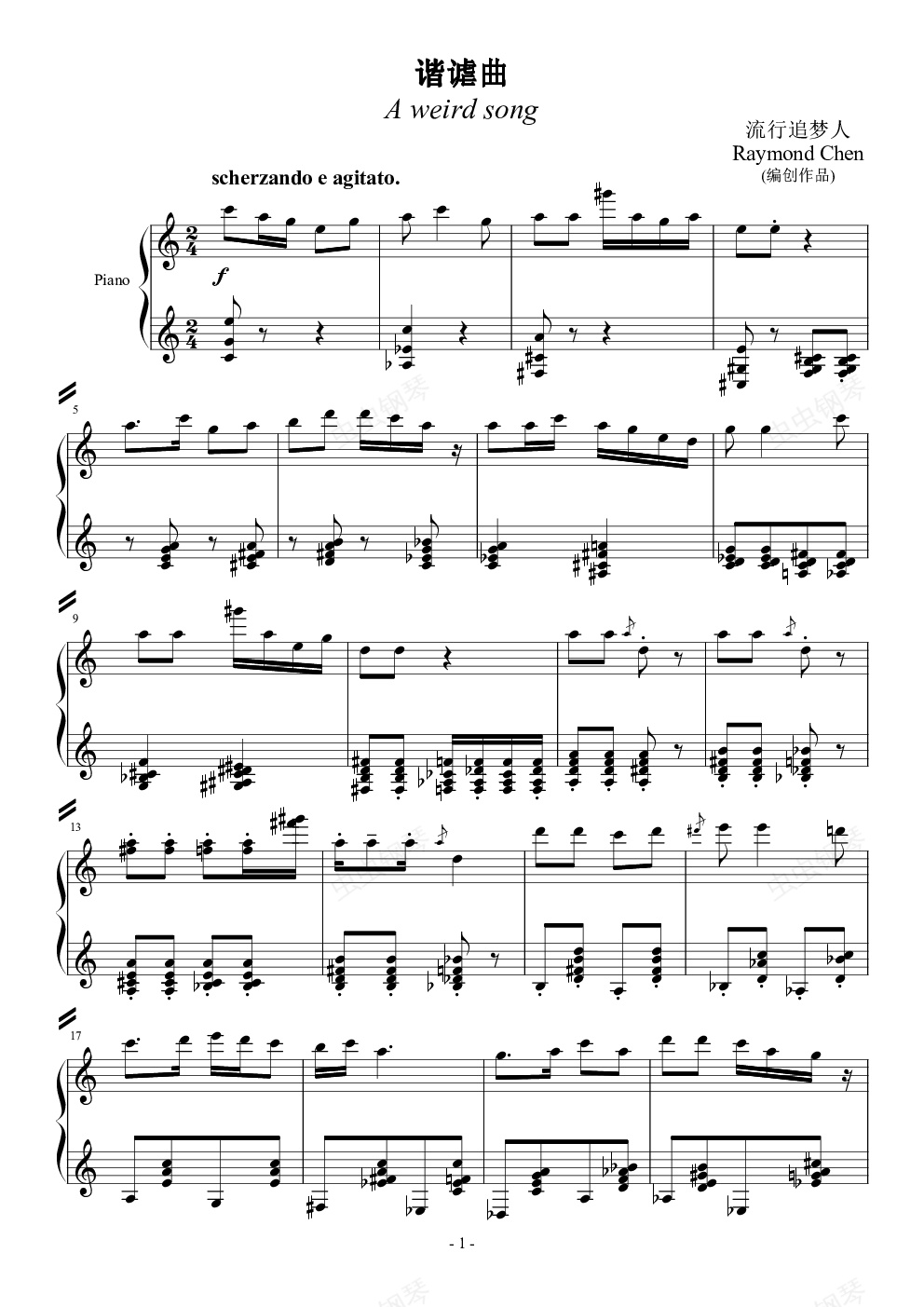 * 此曲旋律全部钢琴演奏即为新(编创)曲《谐谑曲》,唱即为原作《古怪歌》。类型(弹唱)只是标明作品的类型,实为用The Grand 2分开录制。