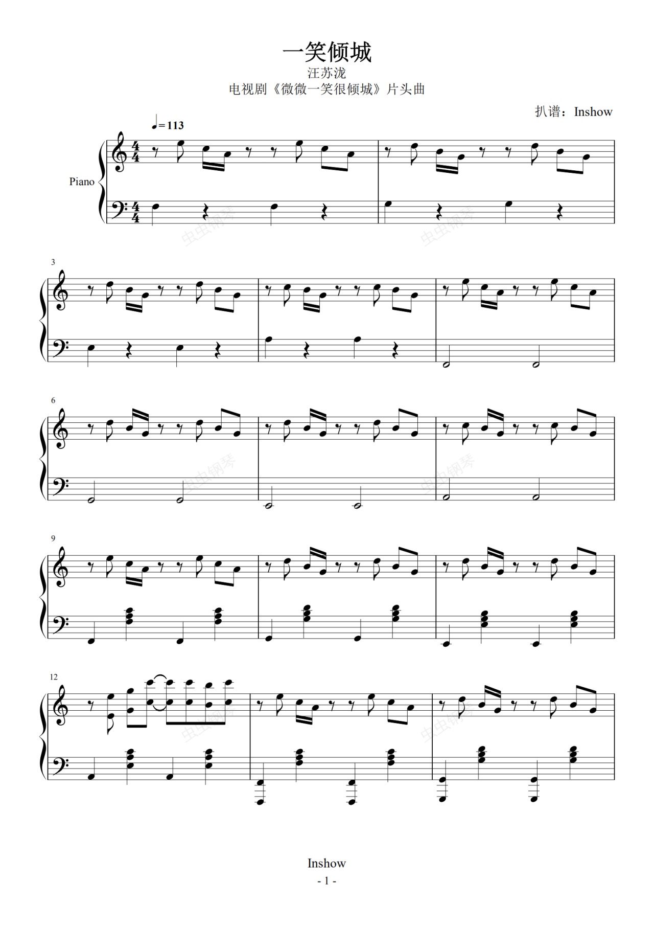 钢琴谱:电视剧《微微一笑很倾城》片头曲- 一笑倾城 - 汪苏泷