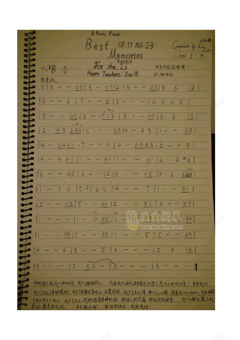 这是一首充满回忆的曲子啊...于教师节献给我的老师,李老师。 我们还记得那暖阳下,我们围聚在草地上,品鉴阅读;我们还记得,那回味无穷,让人惊喜的冰淇淋,在酷暑下放飞了我们多少人的心情;我们还记得,那温柔慈祥的脸庞,那怡人的笑靥,那如花海一般充实的课堂......它们都化为了我们一缕缕的回忆,一丝丝的牵挂,一朵朵的玫瑰......那些记忆,大概是最美的吧…… P.S.曲子和谱子可能在后面差别很大...因为后面我自由发挥了...然后简谱什么的具体别的什么可以见《星无痕》的说明...嗯嗯呃呃...