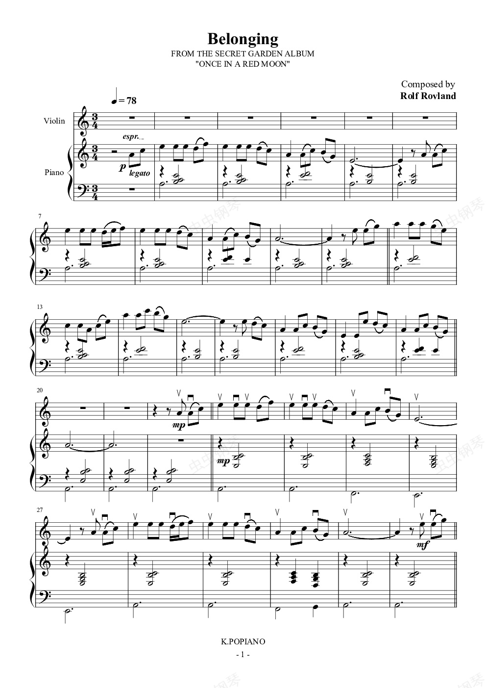 钢琴谱:Belonging