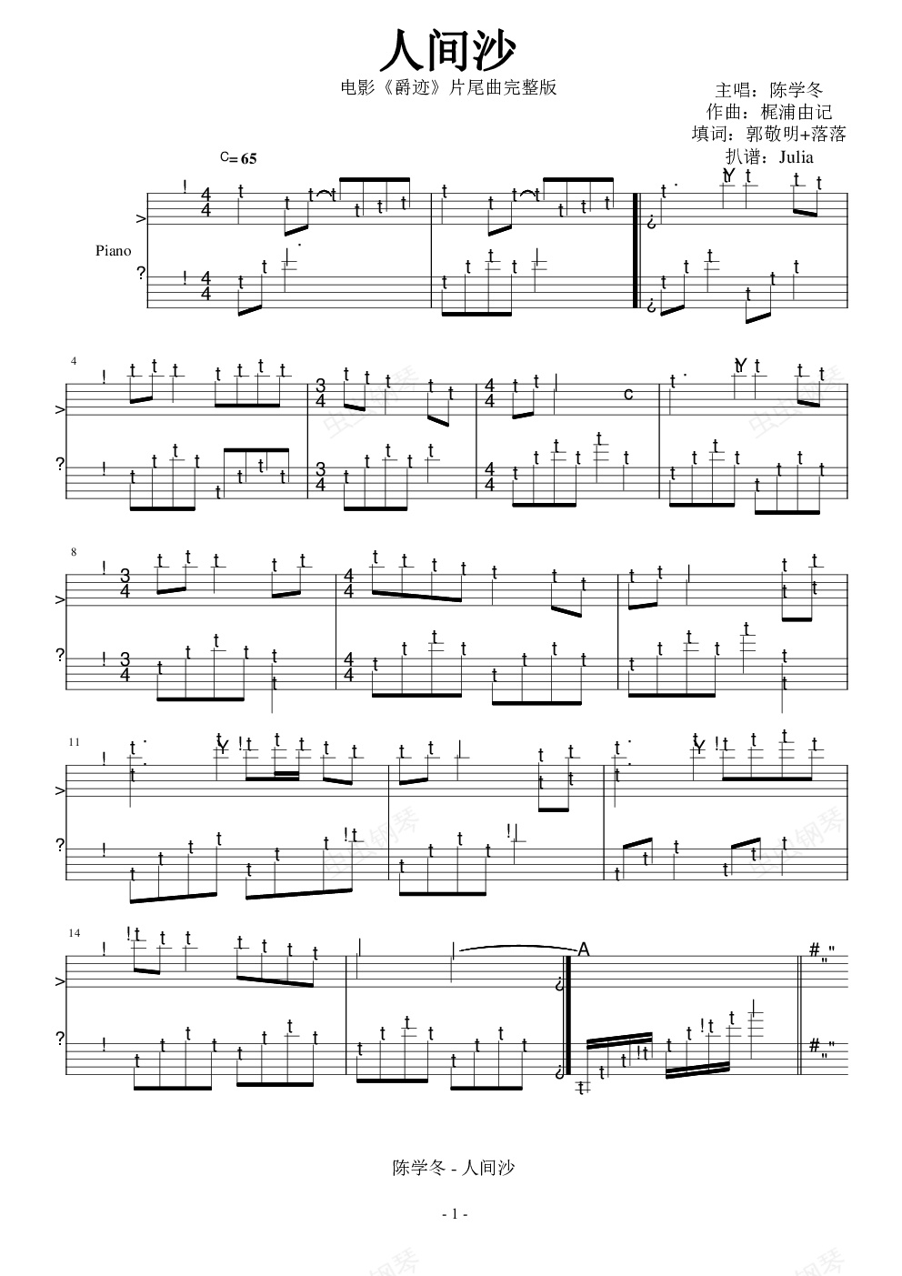 人间沙  演唱:陈学冬  作词:郭敬明,落落   谱曲:梶浦由记    一粒沙 埋在鬓角下  从掌心 开出花  芬芳的沙哑  一句话 能有多牵挂  说爱恨 说誓言  荒凉的庆典  转眼间 英雄已经暮年  你是否 依然孤灯难眠  梦见你我当年  惊鸿一面  肩上纱 化作膝上花  青山的呼唤 万古的伤叹  人世间 有太多恩怨  都来自甘愿 背叛与缠绵  风吹沙 吹败你的无暇  雪融化 化成你梦中白马  你远去的步伐  谁在你 鬓角中埋下  一朵似曾相识 带血的梅花  小窗前 谁还红着眼  等着你再出现 温热那杯盏  与我话当年