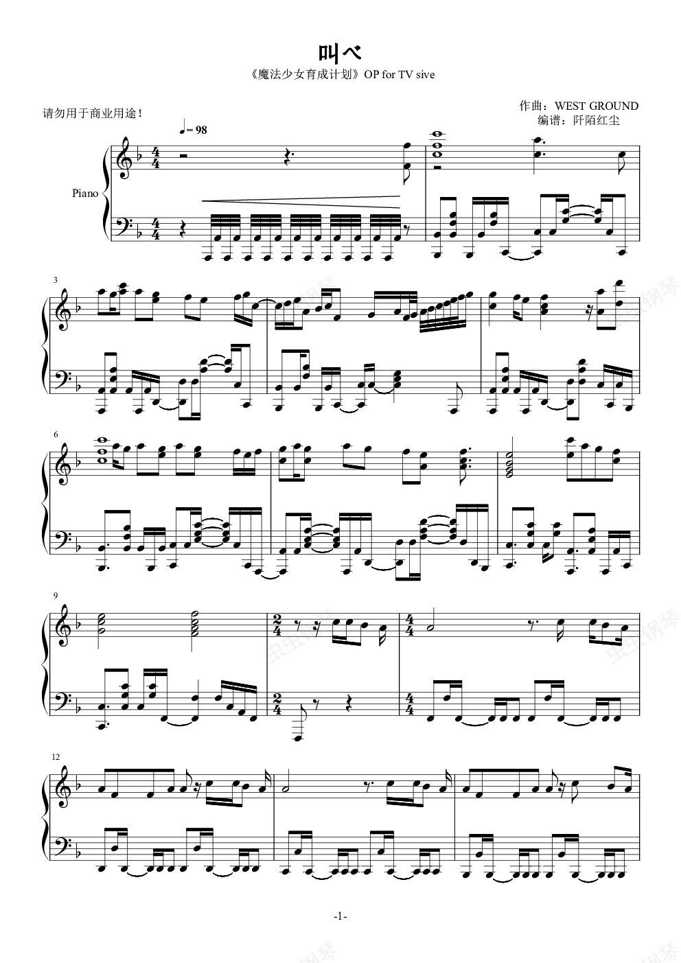 钢琴谱:叫べ——《魔法少女育成计划》OP