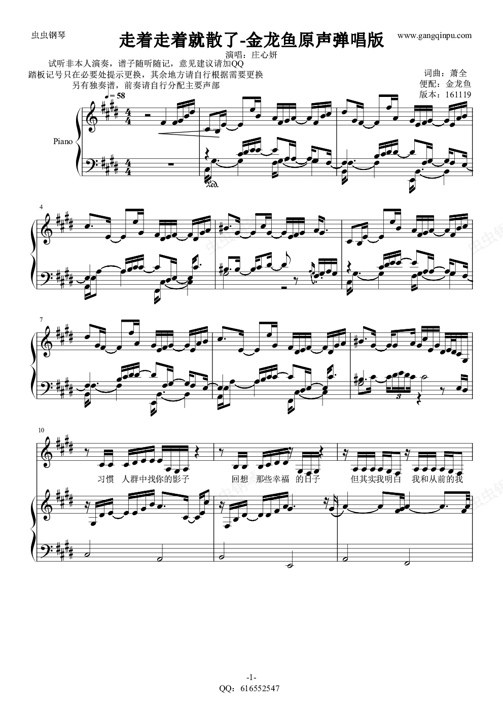 版本说明 免费作谱,音乐钢琴相关的可以问我,有时间都会回复 , 练习之前请确定最新版避免不必要的麻烦 空间日志3个置顶日志可以查看相关信息 金龙鱼钢琴谱 种类分3种: 1、声乐歌曲的独奏、弹唱以及总谱 2、钢琴或其他乐器乐曲的钢琴改编版独奏以及总谱 3、正谱分享、修改、简化 练习之前请看好版本,练习最新版本 练习过程中有任何问题可以加QQ询问 练习之后有任何意见可以互相交流 通用的注意事项(主要产生原因都是本人能力问题): 1、歌唱声部如果有其他颜色的音符,说明是其他人唱的;器乐演奏声部如果有其他颜色的音符,只是用作理论上的标注,无视颜色即可 2、部分曲谱的踏板只要开头位置有,并不指示你全曲后面都不用踏板 3、部分曲谱的表情记号缺乏,并不表示其他地方不用注意表情 4、曲谱之所以有版本号,完全是因为本人能力有限,需要不停学习,不断完善自己的曲谱,并以版本号区分旧新,并无他意 5、老师授予的通用演奏方法(踏板如何使用、表情如何控制等)都适用于本人曲谱,极少的标注,让演奏者可以更加随心,但在未来的作谱中,会逐渐完善必要标注 6、本人并非作曲专业,作谱只是所有工作之余的业余爱好,仅为与大家分享自己的一些想法,没有任何通过作谱赚钱牟利之意,所以你有任何需求,想法,意见等,都可以直接与我本人联系,如果我有时间,会一一回复的 7、所有琴谱确实是本人弹奏记谱,本人手可以跨11键,一般情况下不会出现无法演奏的问题,极少数可能因为演奏者自身原因,如手小等,这个可以和我联系,我来为你做专门的优化 8、本人从2013年开始从事以钢琴为中心的音乐综合教学,如有需求,在时间空间上都有机会的话,可以面授 9、本人发布、更新曲谱的网站只有虫虫钢琴网和弹吧,其中弹吧不能显示歌词,这一点我也很无奈,发布、更新曲谱的平台只有QQ空间,后续会加入其他平台(微博、微信公众号等) 需要说明的一点 本人从开始,将会对所有1114之前发布的曲谱或多或少的进行更新(修改完善踏板、表情、连接等),包括发布一些计划的(计划在QQ空间)、大家提议的新曲谱,在完成优化计划后,将开始对部分项目提供有偿帮助,如: 1、本人曲谱的转调 2、本人曲谱的缩小与放大 3、本人曲谱对特殊需求的更改(比如手弹不到8度、手指少一根等) ……