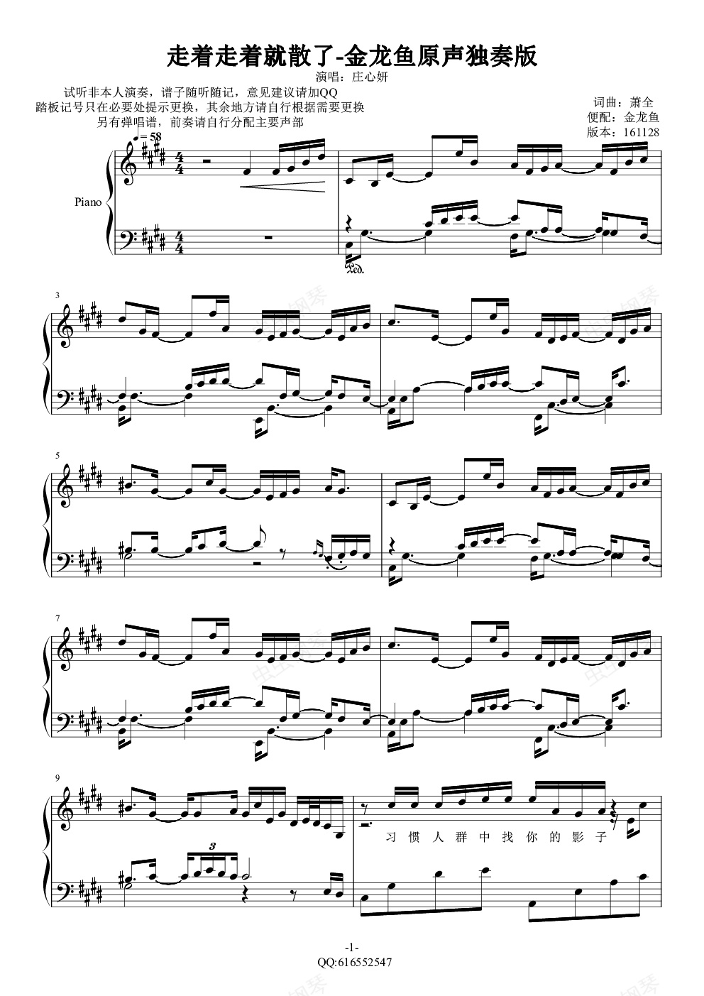 版本说明 免费作谱,音乐钢琴相关的可以问我,有时间都会回复 , 练习之前请确定最新版避免不必要的麻烦 空间日志3个置顶日志可以查看相关信息 金龙鱼钢琴谱 种类分3种: 1、声乐歌曲的独奏、弹唱以及总谱 2、钢琴或其他乐器乐曲的钢琴改编版独奏以及总谱 3、正谱分享、修改、简化 练习之前请看好版本,练习最新版本 练习过程中有任何问题可以加QQ询问 练习之后有任何意见可以互相交流 通用的注意事项(主要产生原因都是本人能力问题): 1、歌唱声部如果有其他颜色的音符,说明是其他人唱的;器乐演奏声部如果有其他颜色的音符,只是用作理论上的标注,无视颜色即可 2、部分曲谱的踏板只要开头位置有,并不指示你全曲后面都不用踏板 3、部分曲谱的表情记号缺乏,并不表示其他地方不用注意表情 4、曲谱之所以有版本号,完全是因为本人能力有限,需要不停学习,不断完善自己的曲谱,并以版本号区分旧新,并无他意 5、老师授予的通用演奏方法(踏板如何使用、表情如何控制等)都适用于本人曲谱,极少的标注,让演奏者可以更加随心,但在未来的作谱中,会逐渐完善必要标注 6、本人并非作曲专业,作谱只是所有工作之余的业余爱好,仅为与大家分享自己的一些想法,没有任何通过作谱赚钱牟利之意,所以你有任何需求,想法,意见等,都可以直接与我本人联系,如果我有时间,会一一回复的 7、所有琴谱确实是本人弹奏记谱,本人手可以跨11键,一般情况下不会出现无法演奏的问题,极少数可能因为演奏者自身原因,如手小等,这个可以和我联系,我来为你做专门的优化 8、本人从2013年开始从事以钢琴为中心的音乐综合教学,如有需求,在时间空间上都有机会的话,可以面授 9、本人发布、更新曲谱的网站只有虫虫钢琴网和弹吧,其中弹吧不能显示歌词,这一点我也很无奈,发布、更新曲谱的平台只有QQ空间,后续会加入其他平台(微博、微信公众号等) 需要说明的一点 本人从开始,将会对所有1114之前发布的曲谱或多或少的进行更新(修改完善踏板、表情、连接等),包括发布一些计划的(计划在QQ空间)、大家提议的新曲谱,在完成优化计划后,将开始对部分项目提供有偿帮助,如: 1、本人曲谱的转调 2、本人曲谱的缩小与放大 3、本人曲谱对特殊需求的更改(比如手弹不到8度、手指少一根等) ……