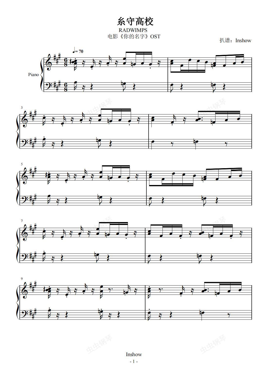 钢琴谱:电影《你的名字》OST- 糸守高校
