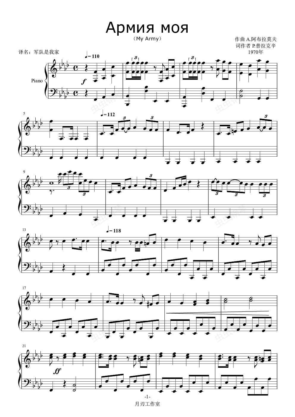 我最喜欢的苏联军歌之一,谱子也是最近才找来,研究以后做上去的。以下只贴出中文版歌词: 1. 一旦祖国面临危难, 军号会把士兵召唤。 我的军队,你时刻在守卫, 你是我的命运,你是我的爱情! 军人的命运平凡,然而艰忍。 这爱情多么严酷,然而忠诚。 我们为艰辛的战斗做好准备, 我们都经历过无数次战斗行军。 从士兵到元帅——我们是一个家庭!一个家庭! 2. 伟大十月和我们一同行军远征, 伴随我们是红军战士的歌声、 战争第一天、胜利的礼炮、 还有牺牲了的父辈的命运... 军人的命运平凡,然而艰忍。 这爱情多么严酷,然而忠诚。 我们为艰辛的战斗做好准备, 我们都经历过无数次战斗行军。 从士兵到元帅——我们是一个家庭!一个家庭! 3. 我们的岁月飞逝, 然而生命永远年轻! 军号嘹亮一如往昔。 我的军队,你时刻在守卫, 你是我的命运,你是我的爱情! 军人的命运平凡,然而艰忍。 这爱情多么严酷,然而忠诚。 我们为艰辛的战斗做好准备, 我们都经历过无数次战斗行军。 从士兵到元帅——我们是一个家庭!一个家庭!