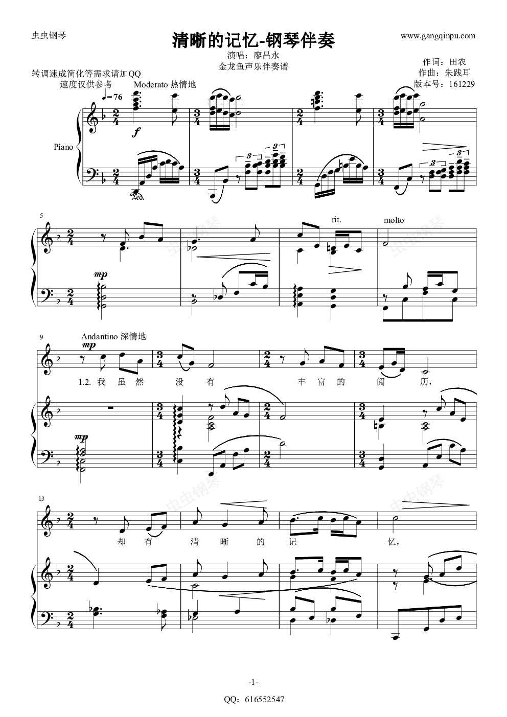 钢琴谱:清晰的记忆-金龙鱼钢琴伴奏161229