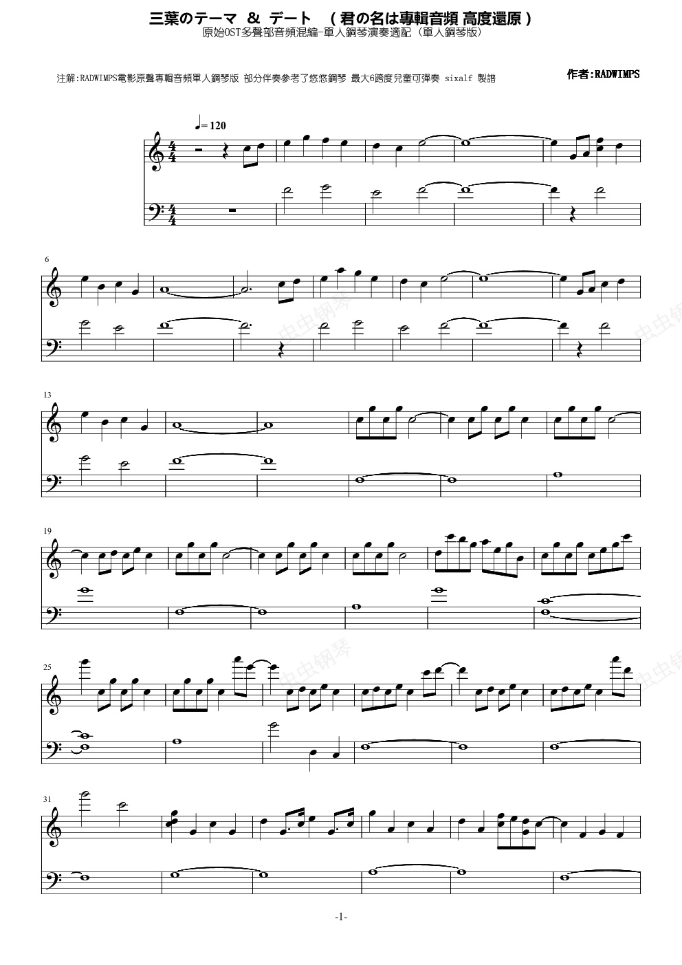 [IMG]/pu/2017/1/17/__1343__[/IMG][IMG]/pu/2017/1/12/__3462__[/IMG]由於網上沒找到較好的鋼琴譜 於是自己爬譜編配 依據電影原聲專輯音頻校對修正 三葉のテーマ 和 デート分別是兩首曲子 各有其優美主樂句 但大部分樂句相同重複 於是各取精華合為一曲 有部分低音伴奏我參考了悠悠即興鋼琴 但改編成較安靜的處理 除此外全是原聲作曲提取校對 領略日式特有的裝飾雙音&猶如水滴般晶瑩剔透的單音之美 降難度最大6跨度 兒童可彈奏 2017.1.5製譜 發現一處跨八度合弦音漏改 在第143小節 2017.1.6已修正重新上傳 感謝琴友指出第3小節音符錯誤 2017.1.12已修正上傳 第37小節彈奏時發現音符錯誤 2017.1.14已修正ove檔